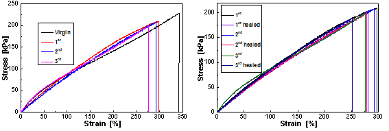 �D5 (a) Repeated macro-repairing of damaged TE�CIN10 samples. Stress-strain curves of virgin and self-healed silicone elastomers, (b) epeatedly healed TE�CIN10 samples, (c) TE�CIN10, TE�CIN20 and TE�CIN30 samples healed at 100 ��C for 12 h.