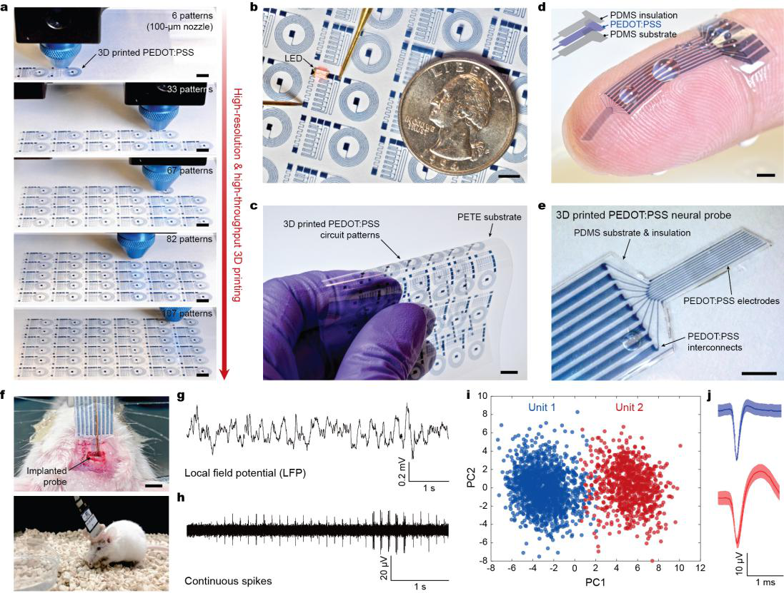 PEDOT:PSS�ijɹ�3D��ӡ������Ҫ�ĬF(xi��n)��(sh��)�r(ji��)ֵ���о��F(tu��n)�(du��)�����Ծی�(du��)���������Ҷ�������PETE������ף��B�m(x��)�����������108��(g��)����·������100 ��m������ӡˢ�r(sh��)�g����30��犣���(sh��)�F(xi��n)�����Ը߾���PEDOT:PSS����·�ij�����ͨ�����죨�D2��������ӡ�����·�����p���c(di��n)��LED���������ڏ���Ť�������W(xu��)�����±��ֹ��ܡ����⣬PEDOT:PSS��3D��ӡ��ˇ�����p���c������(j��ng)��3D��ӡ���ϼ��ɡ��M(j��n)�о����������죬����F(tu��n)�(du��)�ɆT����PEDOT:PSS�cPDMS�Ķ����3D��ӡ�M(j��n)�����̘I(y��)�����ܶ���(j��ng)늘O�����죬���Ƃ�ĸ��ܶ�늘O�����c�̘I(y��)�a(ch��n)Ʒ�ஔ(d��ng)��������ɱ�������͡����ڸ߾��ȡ������3D��ӡ���g(sh��)���F(tu��n)�(du��)�ɹ��_�l(f��)��һ�N��ͨ��ֲ��ʽܛ��(j��ng)̽ᘣ�늘O����9��(g��)PEDOT:PSSͨ���M�ɣ���ӡ���Ȟ�30 ��m����1 kHz�r(sh��)�迹������50 ~ 150 k����ֲ��С���R����(c��)��dHPC������(bi��o)��-1.8 mm AP��1.5 mm ML��-1.0 mm DV�����Գɹ�ӛ�С�������Ƅ�(d��ng)���g��(g��)��(j��ng)Ԫ��(x��)������(j��ng)���(d��ng)��̖(h��o)�������ֲ���늄�(sh��)��LFP����1 kHz���̈́�(d��ng)��늄�(sh��)���B�m(x��)ӛ䛕r(sh��)�g���^���ܣ��D2����