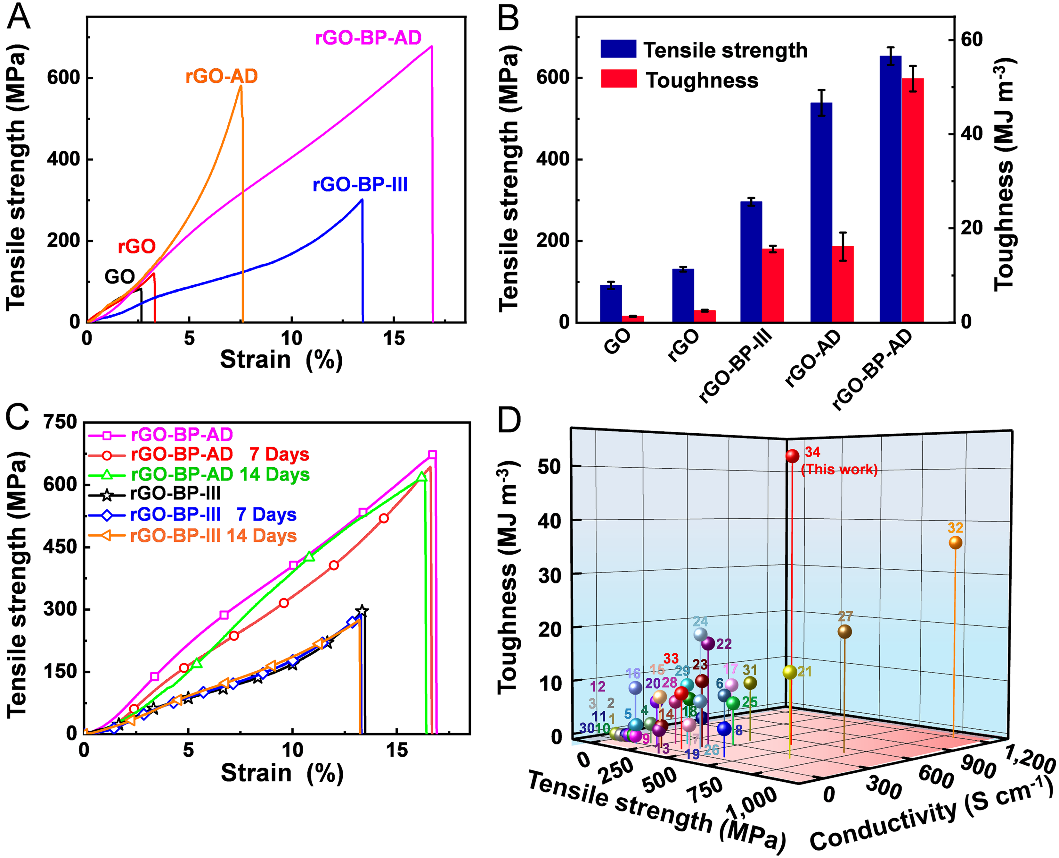 �Mһ���о��l�F�������cʯīϩ��P-O-C���r�I��AD���ӵĦжѷe�����γ��˸�Ч�ąfͬЧ����ʯīϩ��Ĥ���������쏊����ߵ�~653.5 MPa�����ё�׃�_~16.7%����ʯīϩ��Ĥ���g���_��Ŀǰ�����ֵ��~51.8 MJ m-3����ͬ�r�����ں���ʯīϩ�Ĺ��r�I������������ʯīϩ��Ĥ�б��F�����õĭh����������������ʯīϩ��Ĥ�ڿ՚��з���14����������W������׃��