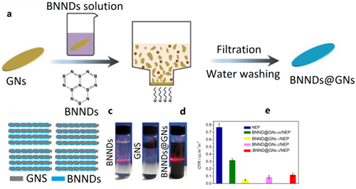 �D2 ��a��BNNDs��ʯīϩ����ij��e�^�̣���b��BNNDs@GNs��(f��)��Ƭ����c��BNNDs��ʯīϩ�ķ�ɢ�О飬��d������ʯīϩ�ۺ���Ϳ�ӵ�������