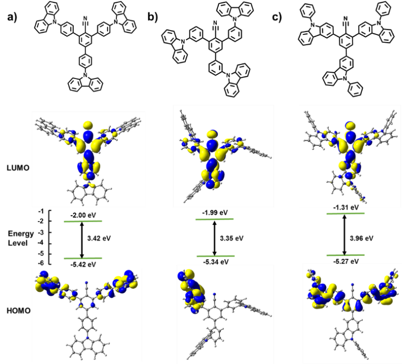 �D2 ��a��3Cz-Ph-CN, ��b��3Cz-mPh-CN, �� ��c��3Ph-Cz-CN �ķ��ӽY������ՓӋ���ܼ�