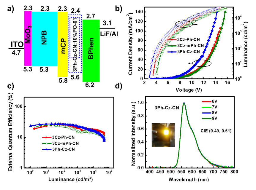 ͨ�^�c�A��������W�R�|�w�����_չ�����������M���˴�������������������ֵ��ע����ǣ������ڰl��Ӻ�늺ɂ�ݔ���g��¼����ͺ�������ã����ڲ���3Ph-Cz-CN�ķǓ��s�ЙC�l����O�ܱ��F�����_18.1%��������Ч�ʣ��D3����
