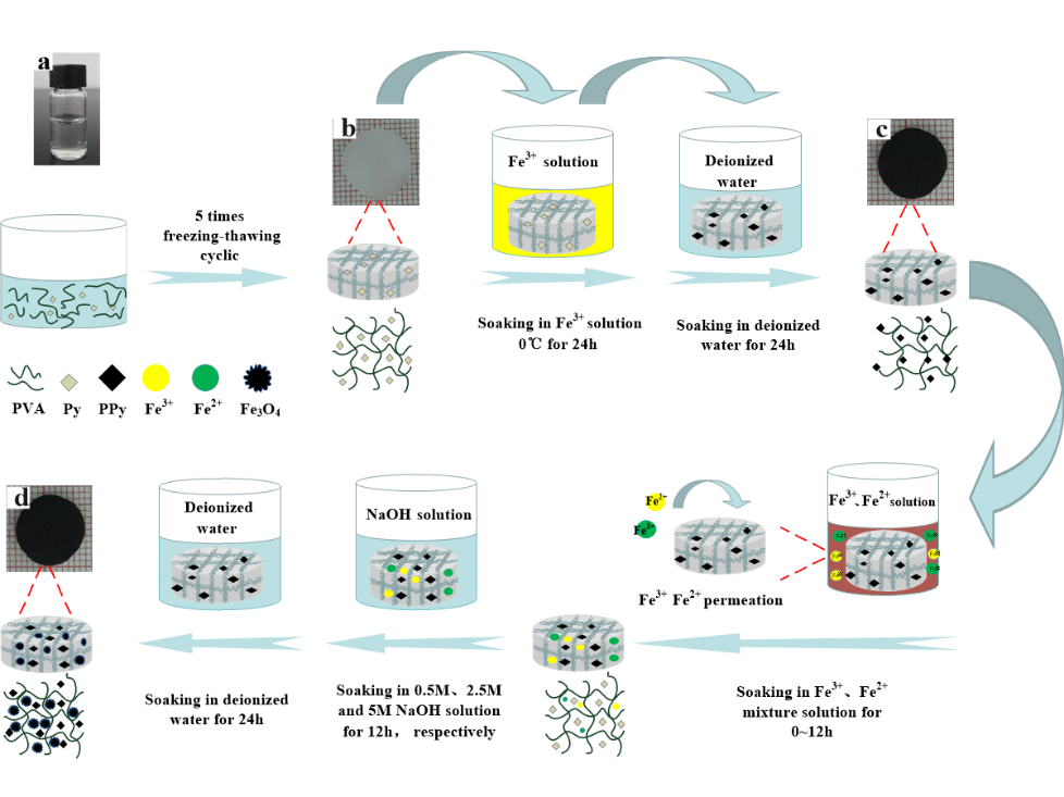 �����̫ԭ������W���G�۸������n�}�M���ͨ�^혴�ԭλ���ھ���ϩ����PVA���W�j�Ȳ��������ɾ��Ќ�����ܵľ�������PPy���;��д�푑��Ե����������F��Fe3O4���{�����ӣ���K�õ������������W���ܵ�늴�ˮ���z��Fe3O4/PPy/PVA�����Ƃ�������D1��ʾ����