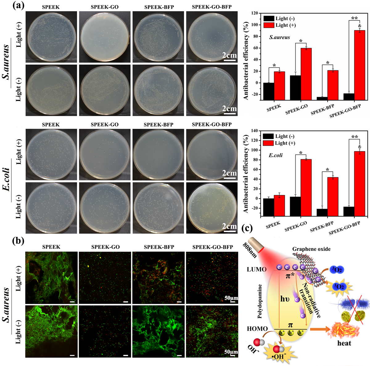 ���գ����˽�Q�@һ���}������-������ψF���ǰ�����ܾ�����ֲͪ���w�аl��Chem. Mater. 2020, 32: 2180��ACS Appl. Mater. Interfaces 2020, 12: 14971�ȣ��Ĺ������A�ϣ��_�l��һ�N��߸�Ч�ɹ��T�������Լ����/�������PDT/PTT���Ͽ����Ķ��S�ǻ�������ͪ��SPEEK�����{��Ϳ�ӣ��D1�����Ծ������S�W�j�Y����SPEEK����ף�ͨ�^��-�жѷe�Ͷ�Ͱ������Ӿۺ��^��������ʯīϩ�{��Ƭ������۶�Ͱ��{��Ϳ�ӣ��γ�����ʯīϩ/�۶�Ͱ����|�YͿ�ӡ��ڽ��t���������£����H����ʯīϩ�;۶�Ͱ��a���B�ӵĹ��Ч�������ҹ���ӏľ۶�Ͱ�HOMO܉���w�Ƶ�LUMO܉�����S��ʯīϩ���@���c�h�������ⷴ���γɆξ��B�������FPDT/PTT�Ϛ�����Ŀ�ģ��D2�����Mһ���ھ۶�Ͱ�Ϳ�����I�Ϲ��T�����ģ�BFP�����x����T�����ܡ���Դ�ڹ��ΑB�l������-7��BMP-7���Ĺ��T�����ģ�BFP�����ѱ��C����BMP-7���и������ijɹǻ��Ժͳɹ���������������ɹ��T������ԓ�wϵ��ALP���ԡ��}�Y�����ɡ��ɹǻ�����_�cֲ����������γ���r���D3���ȶ����������c���սM��Ⱦ����@�����������BFP���ĵ�����������˶���PEEKֲ���w�⚢��������������Ժ��������ܡ��������Ϯ��|�YͿ�ӵ����������δ�����κο���������r�£����F�ˌ�������PDT/PTT��Ч���磬ͬ�r�Ծ��Ѓ������w�ȵĹ��ޏͯ�Ч���Ƅ�PEEKֲ���w���R���ϸ�Ⱦ�Թ�ȱ�p�����е�ʹ���_����