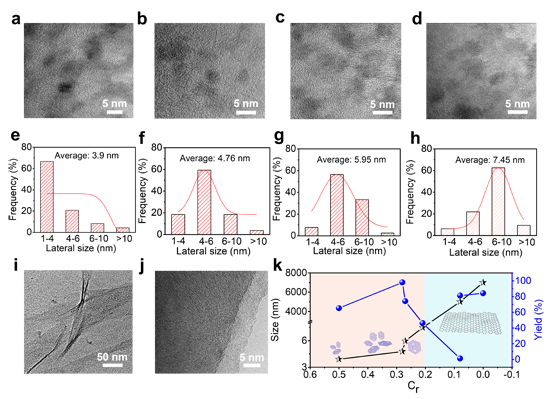 �D4. ԭ�ϽY(ji��)��(g��u)��ʯīϩ���a(ch��n)��ߴ�ͮa(ch��n)�ʵ�Ӱ� ��a-d��800��1300��2000��2800 ��̎����ԭ���Ƃ�������c��TEM�D���䣨e-h������(y��ng)�ijߴ�ֲ�����I,j��ʯīϩ��TEM�D ��k��ԭ�ϽY(ji��)��(g��u)�ͮa(ch��n)��ߴ缰�a(ch��n)�ʵČ���(y��ng)�P(gu��n)ϵ��