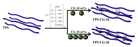 �����A��������W�C���WԺ��ˮ�������n�}�M�Է����D�������ľ��н���-�ЙC��λ���������õĸ�����TPS�ͺϲ��ϡ��������Կ�ʳ�õ����������}��CG��������x��Դ��ͨ�^�����D���Ƃ�õ�����Ca2+-������λ���������õ�TPS-CGs�ͺϲ��ϡ��Y���l�F��TPS-CG�IJ������D׃�ضȣ�Tg���SCG������������u���ߡ���CG������20 wt%�r��TPS-CG��Tg�_��67�棬�^TPS����˽�20�档TPS-CG�ě_�ȡ����쏊�Ⱥ����w��Ҳ�քe�����52.4%��44.2%��360%��(Zhang Shuidong, et al. Composites Science and Technology, 2018, 159: 59?69)