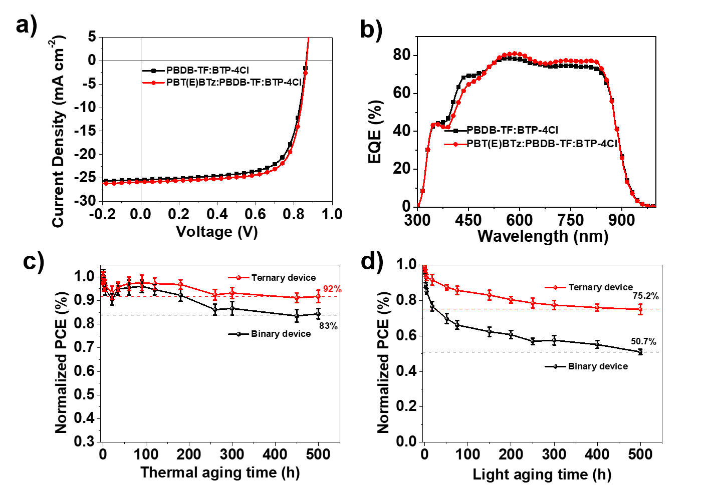 �����Mһ���C���@һ�l�F������ͨ�^�xȡ���m�Ķ�Ԫ�wϵPBDB-T��IT-M�Mһ�������cPBT(E)BTz��HOMO�ܼ��������5%��PBT(E)BTz�r�������l�F��Ԫ������ͬ�ȳ̶ȵ���ߣ���10.5%��11.06%����Ȼ�������xȡ����һ����Ч�Ķ�Ԫ�wϵPBDBTF:BTP-4Cl���C��PBT(E)BTz��������M�ֵ����m�ԣ���D3�������l�F��������������PBT(E)BTz��5%���r����Ԫ�ۺ���̫���늳صĹ���D�QЧ�ʿ����_��16.26%���@Ҳ��Ŀǰ��Ԫ�ۺ���̫���늳����Ч��֮һ�����⣬�����l�F����PBT(E)BTz�����ӿ�������һ�N��Ч���������ܡ�����������ͬ�r��߶�Ԫ�����ğ᷀���Ժⷀ���ԡ�ԓ��Ԫ�wϵ��ͬ�r������������ܺͷ������ṩ�˺�����Ч�IJ��ԡ�