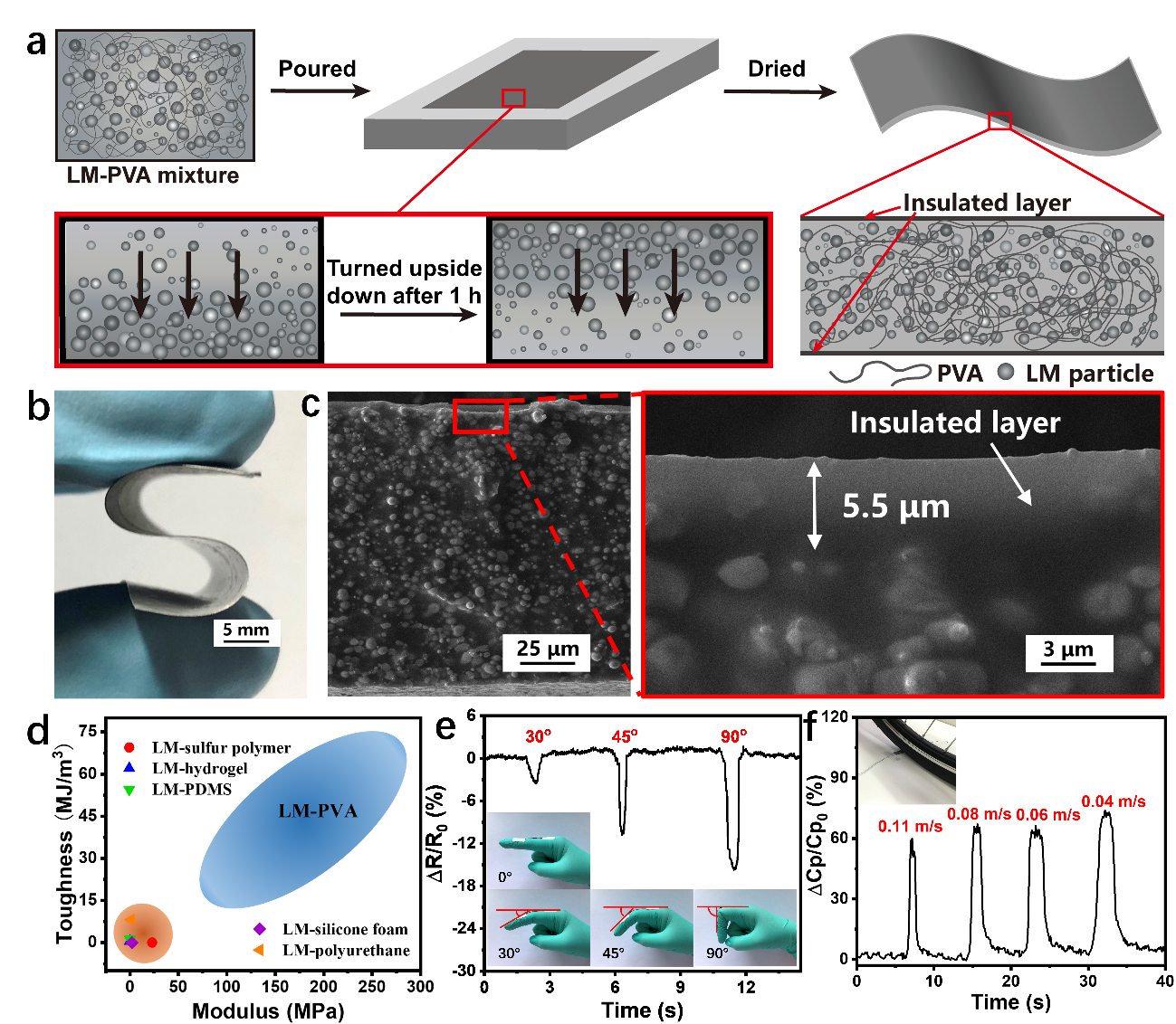 �F�ͨ�^��Ч��ԭλ�ۺϳɹ������������Ժ͌�늵�LMͿ����ĭ��LM-Foam�����ۺ���������ԺͲ�������ʹ��Һ�w�����ڿ��ٰl���^���п��Ը��w�ڿı��������Ķ��ṩ�˾ۺ�����ĭ�Č���Ժ͏������������˶�Y�����õ���Һ�B������ĭ���Ѓ����ęCе���ܺ�늌W�`���ԡ����D1a��ʾ�����������c���Ѷ�Ԫ����ˮ�������ɾ۰����W�j�������^����Һ�B���ٱ�������̼���������������S���߷��ӵľۺ����ڿ��ȱ������D1b���������Ŀ�������Y����Һ�B���١����ھ��ж�Y����LM-Foam�@ʾ�����ܶ�����ɫ�ď��Ժͳ�ɫ�ęCе��������Һ�B������ĭ���и�늌���(3.9×104 S/m����������LM-��ĭ�е����w�͌�����Ͽ����c�ۺ�����wһ��׃�Σ��Ķ��ډ����®a���~������׃�����Ķ��ṩ�˪��صĸБ��О飬���푑��`���ȣ�푑�����GF> 25�����^�̵�푑��r�g��202���룩�ͳ�ɫ��늷����ԣ�800��늉��sѭ�h�������׃�������߷��ӿ��ijߴ�ֲ�������������LM��ĭ���F����ͬ������λ����ه���`���ȣ��Ķ���������늚Ᵽ�o��ĭ�����D1f��ʾ��Һ�B������ĭ����������ȫ�ٶȾ�������ͨ�^��ͬ�ٶȮa�������̖�팍�r�O��؛������ܵ��ēp����