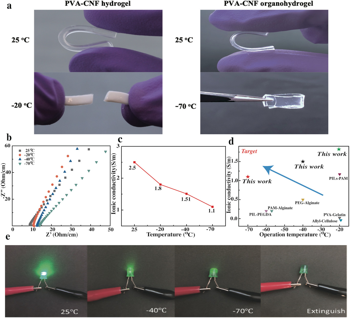 �D3. PVA-CNF�ͺ����z�Ŀ������F. a) PVA-CNFˮ���z���ЙCˮ���z���Ҝغ����µ���ò��Ƭ b) ���z�ڲ�ͬ�ض��µĵ�EIS�D�V��25, ?20, ?40, �� ?70 ��C��c)��ͬ�ض��µ��x��늌���; d) �c֮ǰ������������z�����܌��ȣ�e) ��ͬ�ض��£����z�����錧�w�����·�c��LED����������