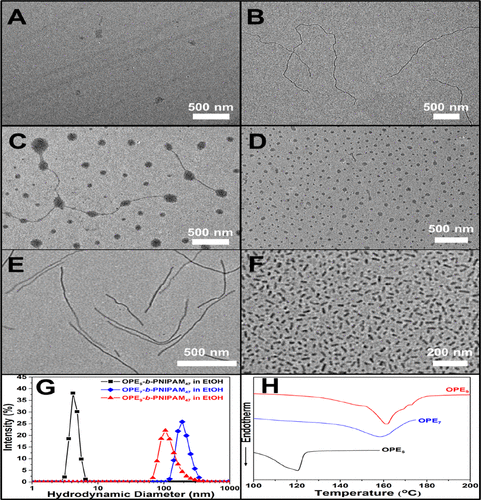 �D2. (A) OPE5-b-PNIPAM47��(B) OPE7-b-PNIPAM47���Ҵ���Һ(0.05 mg/mL)�� TEM��Ƭ��OPE7-b-PNIPAM47�{���w�S(C)�Ҝط���7���Լ�����(D) 0����30 ���ӵ�TEM��Ƭ��(E) OPE9-b-PNIPAM47���Ҵ���Һ(0.05 mg/mL)�Լ�����(F) 0����30���ӵ�TEM��Ƭ��(G) OPE5-b-PNIPAM47, OPE7-b-PNIPAM47�� OPE9-b-PNIPAM47���Ҵ��е�DLS�D��(H) OPE5, OPE7��OPE9 ��DSC������