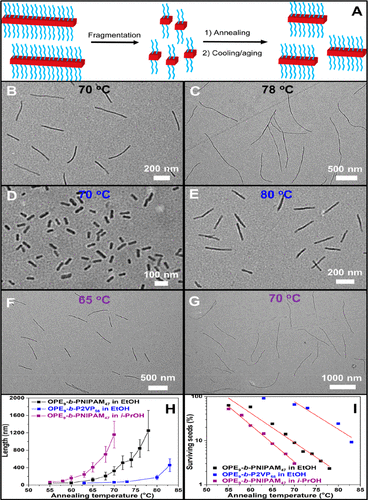 �D4. (A) �Ծ��N�^��ʾ��D��OPE9-b-PNIPAM47���N�����w�S�ڲ�ͬ�ض����˻�(B) 70��C��(C) 78��C�γɼ{���w�S��TEM�D��OPE9-b-P2VP56�����N�����Ҵ���Һ (0.05 mg/mL)���˻�(D) 70��C��(E) 80��C���γɵļ{���w�STEM��Ƭ��OPE9-b- PNIPAM47�����N������������Һ(0.05 mg/mL) ���˻�(F) 65��C��(G) 70��C���γɵļ{���w�S��TEM��Ƭ��(H) �w�S���z���L���S�˻�ضȵ�׃����(I) ���Ҵ�N�����S�˻�ضȵ�׃����