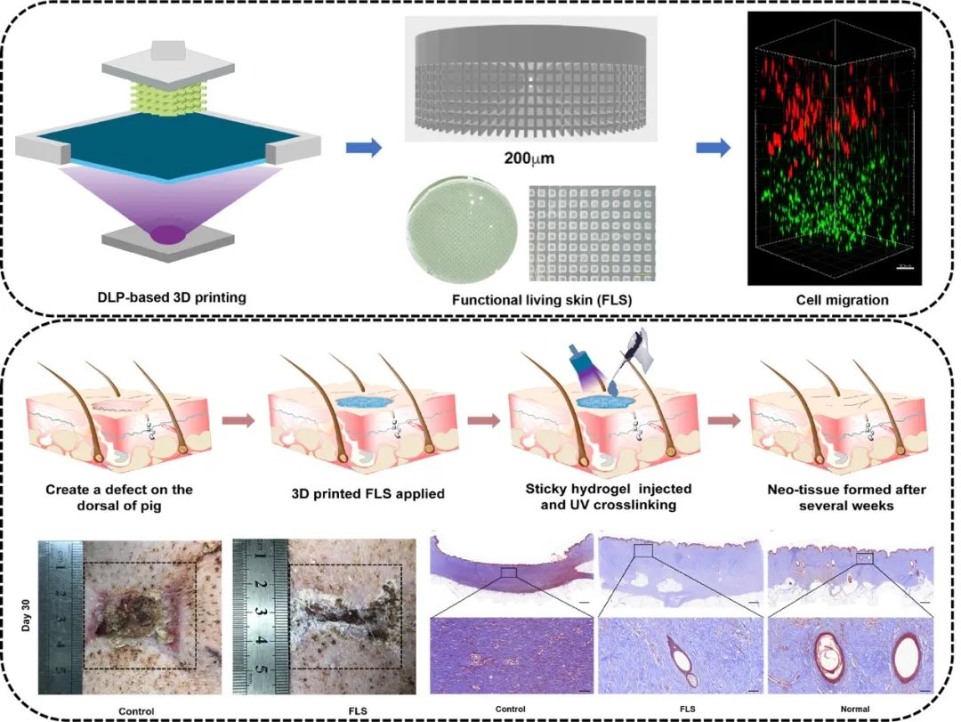 ԓ�о�ͨ�^DLP 3D��ӡ���g(sh��)���аl(f��)���ͷ�������īˮ���ϣ��Ƃ��˹����Է�����Ƥ�w�����������O(sh��)Ӌ(j��)���p�ӣ���Ƥ����Ƥ������Ƥ�w֧��ģ�ͣ���GelMA/HA-NB������3D�����ӡīˮ����ϻ��Լ�(x��)������Ƥ�w���w�S��(x��)������Ě�o�}��(n��i)Ƥ��(x��)���������ÿ��ٹ�̻�3D��ӡ�C(j��)�Ƃ��˷���Ƥ�w������Ƥ�w���؞ͨ�Ŀ����Դ��M(j��n)�I�B(y��ng)���M(j��n)�������Ľ��Q�������ڼ�(x��)��𤸽���w�ƺ���ֳ�c�����M���γɡ���ͬ�Ӽ�(x��)�����όӣ���Ƥ�w���w�S��(x��)�����ӣ���Ě�o�}��(n��i)Ƥ��(x��)�������ʾ����_(d��)95%���ϣ��Ҳ�ͬ�Ӽ�(x��)��֮�g���l(f��)����(x��)���w�ơ���ԓ����Ƥ�w֧��ֲ�뵽����Ƥ�wȫ��ȱ�p̎��ֲ�����������Ƥ�w���o(h��)��瑪(y��ng)���̼����ܣ�ͬ�r(sh��)������(d��o)Ƥ�w�����ޏ�(f��)�������ڴ��̈́����i����Ҳ�õ���ͬ�ӵ�Ч��������ԓ����Ƥ�w������Q�R�����w�M�������ٲ��㆖�}��ͬ�r(sh��)�o�������ٵ��Ƃ��ṩ����˼·���ڲ��h(yu��n)�Č������������R���ί���