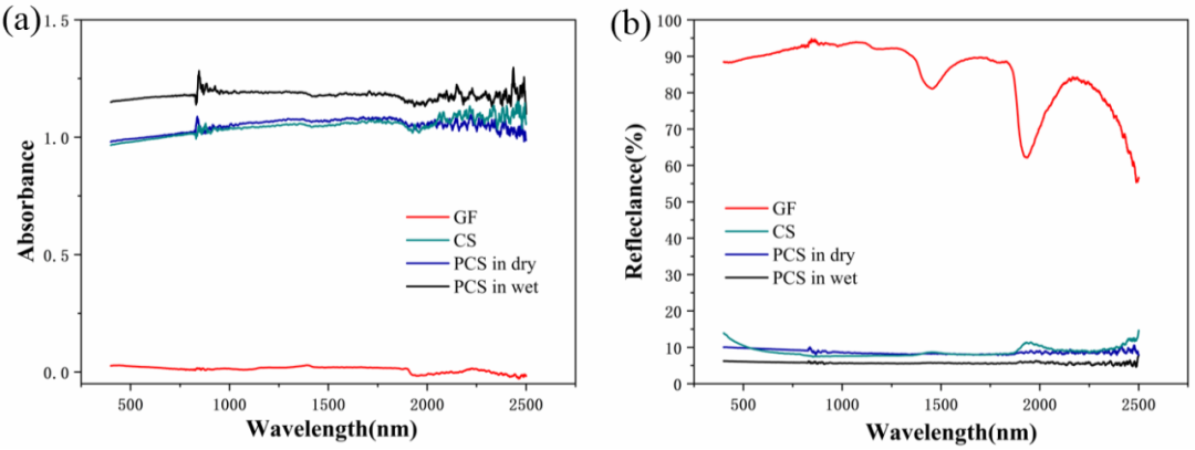 PCSĤ�����^���Ĺ����������nj��F��̫��ܟ��D�QЧ�ʵ�ǰ�ᡣ�cGFĤ�ĸ߷��䣨>80%���͵�������ȣ�CS��PCSĤ��400�C2500 nm�IJ��L�����Ⱦ��зdz��ߵĹ����պͷdz��͵ķ��䣨<10%��ֵ���@��һ���g�ӵ��C�������̼Ϳ�ӵĴ��ڣ�����Ҫ��̼�����ա���400-2500nm�IJ��L�����ȣ�PCS��CSĤ�Ĺ����պͷ���ֵ���ơ����D4a��b����ͬ�r��PCSĤ��CSĤ��GFĤ�ͼ�ˮ���ڹ���15��犺�ضȷքe������23.5�桢23.6�桢14.4���8.8�棬�@Ҳ�f����̼Ϳ�ӵĴ����{���˲����w�SĤ�Ĺ���D�����ܣ��D5����