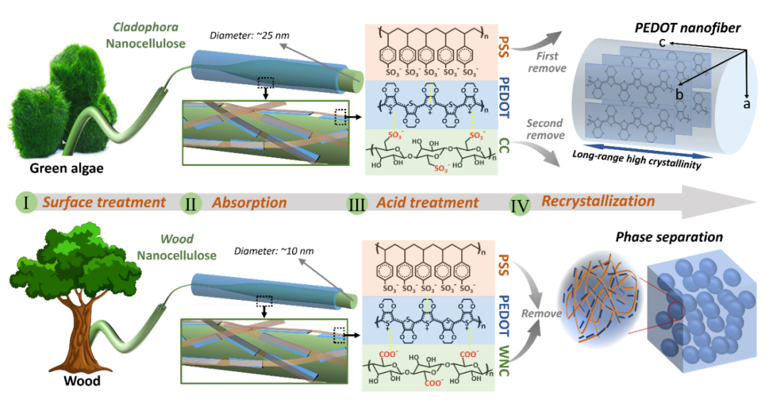 ���ψD��ʾ���˹������õ�Cladophora�{���w�S�أ�CC����һ�N�ľG������ȡ�ĸ߽Y���ȵ������|�{���w�S���Y���ȸ��_95%���ϡ��߽Y����ʹ������65wt.%�ĝ�������ˮ���ʷdz��ͣ���˿�ͨ�^65wt.% ������̎����CC�������������F�����ữ��CC��ͨ�^�o�����T��PEDOT:PSS�������ۼ��γ�CC@PEDOT:PSS ���˚��Y�������о��Mһ���l�F���ữ��CC��95wt%�ĝ������Е�����ˮ������ˮ���������@С��PSS�����������95wt%�ĝ������Mһ��̎��CC@PEDOT:PSS�ĕr��PSS�����ȱ����������ˮ�⣬ͬ�rPEDOT�������CC�����ؽY�����S��CC��������ˮ�⣬�T���γɸ߽Y���ȵ�PEDOT�{���w�S�����錦�Ȍ���������^�ͽY���ȵ�ľ�|�{���w�S�أ�~60%��ͨ�^TEMPO������������Ȼ�����ģ���T���γɵ�PEDOT���w���ѷe�γɵ�����x�Y������ԭ���Դ��ľ�|�{���w�S���^�͵ĽY���Ȍ��µĵ͵�������ʹ������PSSˮ��֮ǰ���ѽ��S֮ˮ�⣬��ģ���T����������