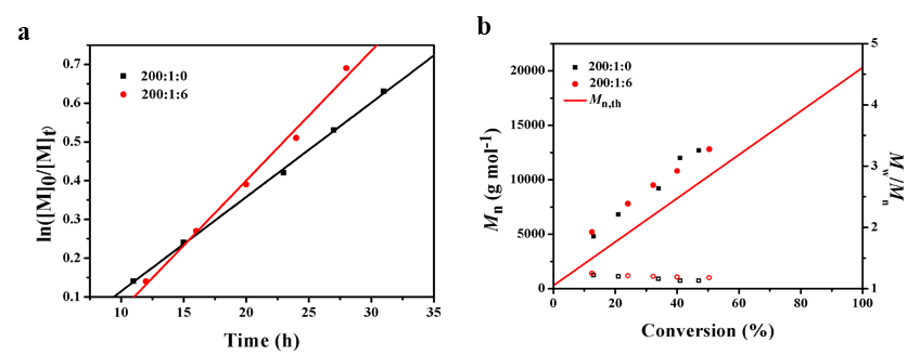 �D1. �{�⣨��max=460nm�������£���DMSO�м��벻ͬ����TEA��0��6 equiv.���M��SiQDs��MMA��PET-RAFT�ۺ�����a��ln([M]0/[M]t)vs Time;��b��Mn vs Conversion��