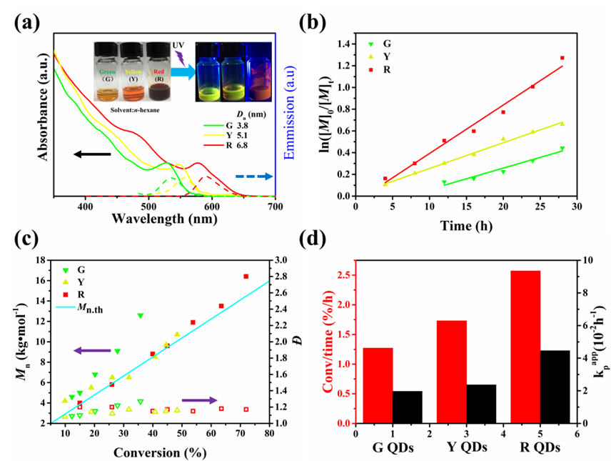 �댧�w�����c��QDs�����з����Ĺ�W���ܺ�Ч������D�����ʡ�����ԓ�������ԣ�����������������õ����T����ӻ������D���ӵĿ���ӳ�-������D�ƣ�PET-RAFT�������У�����u�ܵ��V�����Pע����QDs�����ӳߴ�Ч���������պ�����D�ƾ����@����Ӱ푡����ǣ�ԓ�I��������о��У�ȱ�������ӳߴ�Ч����ӑՓ����ˣ��о����xȡCdSe QDs������������Ƃ䲻ͬ�ߴ��QDs���M��PET-RAFT�ۺϵĄ����W�о������Y���������S��QDs�ߴ�����ӣ��D 1 a�������L���ʳ�����kpapp����u׃�ۺ��������@���ӣ��D 1 d����������÷������c��Փ���������ӽӽ����D1c�������Ч�ʣ�I*=Mn,th/Mn,GPC����ֵ���ӽ�1����˳ߴ��^���R QDsʹ��ԓ�ɿ����ɻ��ۺ��wϵ�������롣�S֮���ڴ�����R QDs�l���£��^�m̽ӑ�˲�ͬ���ղ��L���܄��O�Ե����،�PET-RAFT�ۺϵ�Ӱ푡�