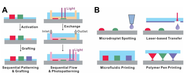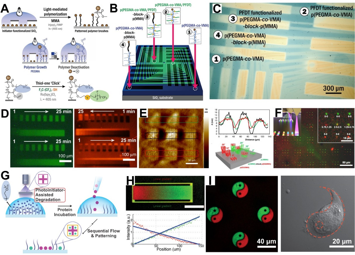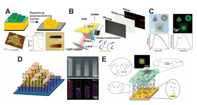 �D5 (A)��3D�D����PMMA�ۺ���ˢ�����g�̌��Ƃ�3D���ٽY����(B)����������ӽ�֦�ۺ���ˢ��еı�����x���w�������(SPRi)оƬ���M�и�ͨ��������(C-D)���S�ۺ���ˢ���F�����ܶȹ̶��c�����x����ճ����(E)�ӽ��۱�ϩ����(PAAm)Ƕ�κ�픲���RGD�Ĺ��ܻ��ľ۱�ϩ��(PAA)Ƕ�νY�����ڼ���ճ���о���