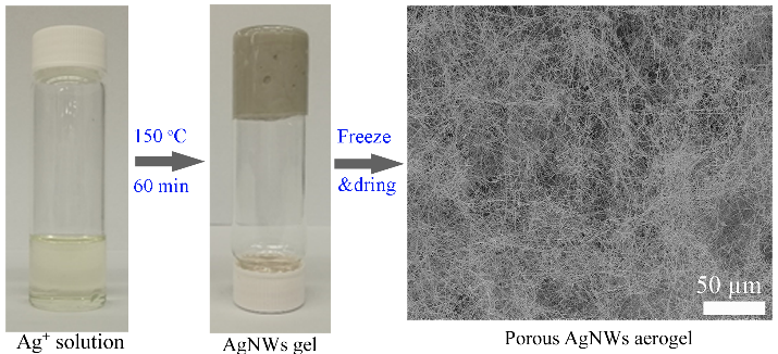 ���z��Փ�J(r��n)�鮔(d��ng)�{�ײ��ϣ����{�����{��Ƭ��{�ܣ����܄��еĝ���_(d��)��һ��ˮƽ��������|���͡�朽ӡ��ęC(j��)��(hu��)׃�ߣ��������|�l(f��)�γ��z������ѭԓ���z�γ���Փ��ԓ�F(tu��n)�(du��)�O(sh��)Ӌ(j��)��ԭλ�ϳ��y�{����AgNW���Ƃ��y���z�ķ�����ͨ�^(gu��)ֱ�Ӽӟ����õ������y/�Ҷ���/�Ȼ��F��Һ���������y߀ԭ���y�{�������@���y�{�����z��ԓ����(y��ng)�У��Ҷ������������܄���߀ԭ�����Ȼ��F�������Ǵ������ӿ�߀ԭ�ٶȲ��x���Ժϳɼ{���������y�ĝ���^�ߕr(sh��)�����������z���γɡ���D1��ʾ����150��Cֱ�Ӽӟ������y��Һ60��犺�ͨ�^(gu��)�������@����AgNW�����z��ԓAgNW�����z���и߶ȶ�ĽY(ji��)��(g��u)���ܶȿɵ���10.7 mg /cm3���ڿ՚��о������õķ�(w��n)���ԣ������г�ɫ�Č�(d��o)��Ժ��^�õęC(j��)е���ܡ���(d��ng)�����z���ܶȞ�24.3 mg / cm3�r(sh��)����늌�(d��o)�ʞ�2.1×105 S / m���c���y(t��ng)�Ҹ�Һ������T���Ƃ��AgNW�����z��ȣ��˚����z��늌�(d��o)�ʺ͗���ģ���@����ߣ��քe������(y��ng)ֵ��126����4.6����