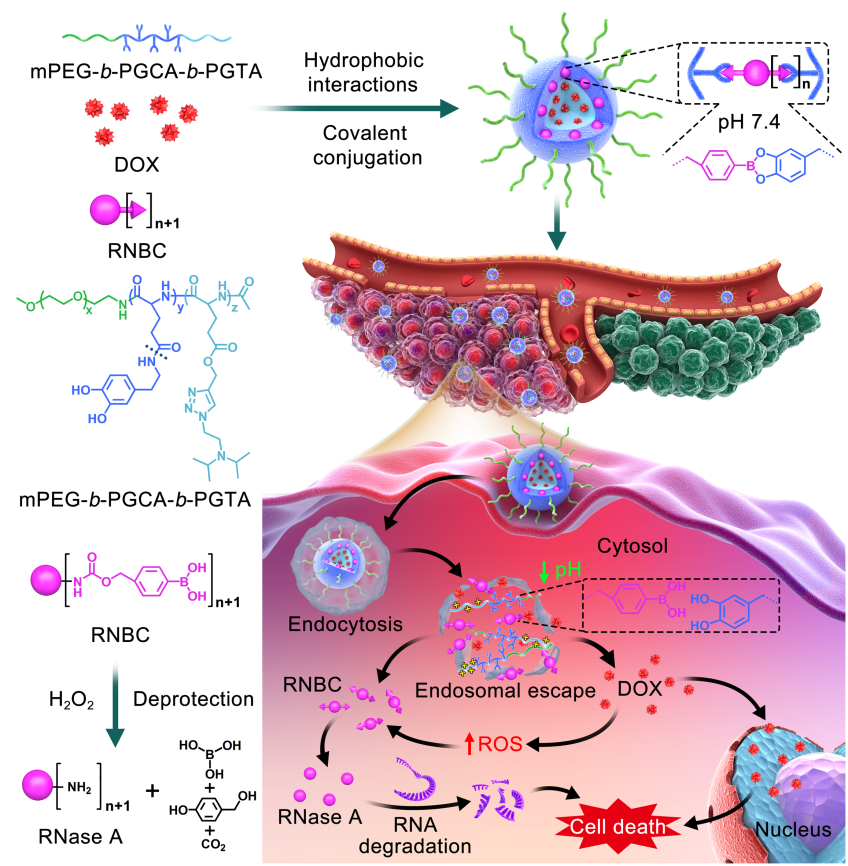 ᘌ����φ��}���Ї��ƌW(xu��)Ժ�L����(y��ng)�û��W(xu��)�о���ꐌW(xu��)˼Ժʿ��Ф�������о��T�F(tu��n)��O(sh��)Ӌ���ϳ���һ�N�����������ӣ�CA����(c��)������������TA����(c��)����mPEG-b-PGCA-b-PGTA��Ƕ�ι�������������ڸ�Ч����(d��n)�d���Ǻ���øA��RNase A���Ͱ�ù�أ����F(xi��n)�˸�Ч�ąf(xi��)ͬ���[��Ч�����D1�������У���ù�أ�DOX����������pH푑�(y��ng)�Ե�PGTA朶Σ������������RNase A��RNBC���tͨ�^ͨ�^�������I���r�Y(ji��)�����Ó�(d��n)�d�ں��������ӻ��F(tu��n)��PGCA朶Σ��Ķ��γɷ�(w��n)�����dˎ�{�����ӡ���(d��ng)�dˎ�{�������M(j��n)�뼚(x��)����(n��i)���w/��ø�w�������h(hu��n)����ʹPGTA朶ε���������(c��)���|(zh��)�ӻ�����PGTA朶��Hˮ�����ӡ�ͬ�r�����������c������ĽY(ji��)������Ҳ�����ԗl���½��x���Ķ����F(xi��n)DOX��RNBC�Ĺ�ͬጷš�PGTA朶ε���������(c��)��߀�����|(zh��)�Ӻ��dЧ��(y��ng)���܉�?q��)��F(xi��n)RNBC�ă�(n��i)���w/��ø�w���ݣ������ݺ��RNBC����DOX�錧(d��o)�İ���(x��)����(n��i)��ˮƽROS���������F(xi��n)��������F(tu��n)��ȥ����֏�(f��)����Ȼ��RNase A���Ķ����F(xi��n)��Ч�ąf(xi��)ͬ���[�����ã��D1����