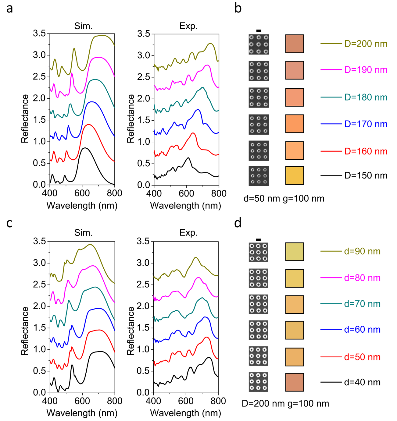 �@�N�������ɶ��������r���ϵĹ�/��������{�h��нM�ɣ��D1a����ͨ�^�������̣�EBL����늸���ϵ��x���w���g��ICP���Ș˜��{�ӹ���ˇ�����Ƃ���ͨ�^��������@�R��SEM���ı��������Ƃ�ij�����Y����Ԫ�߶���100nm ��400nm���D1b����ͨ�^�{��������ĽY���������܉��^�쵽�S����ʵ��ɫ���D1c����
