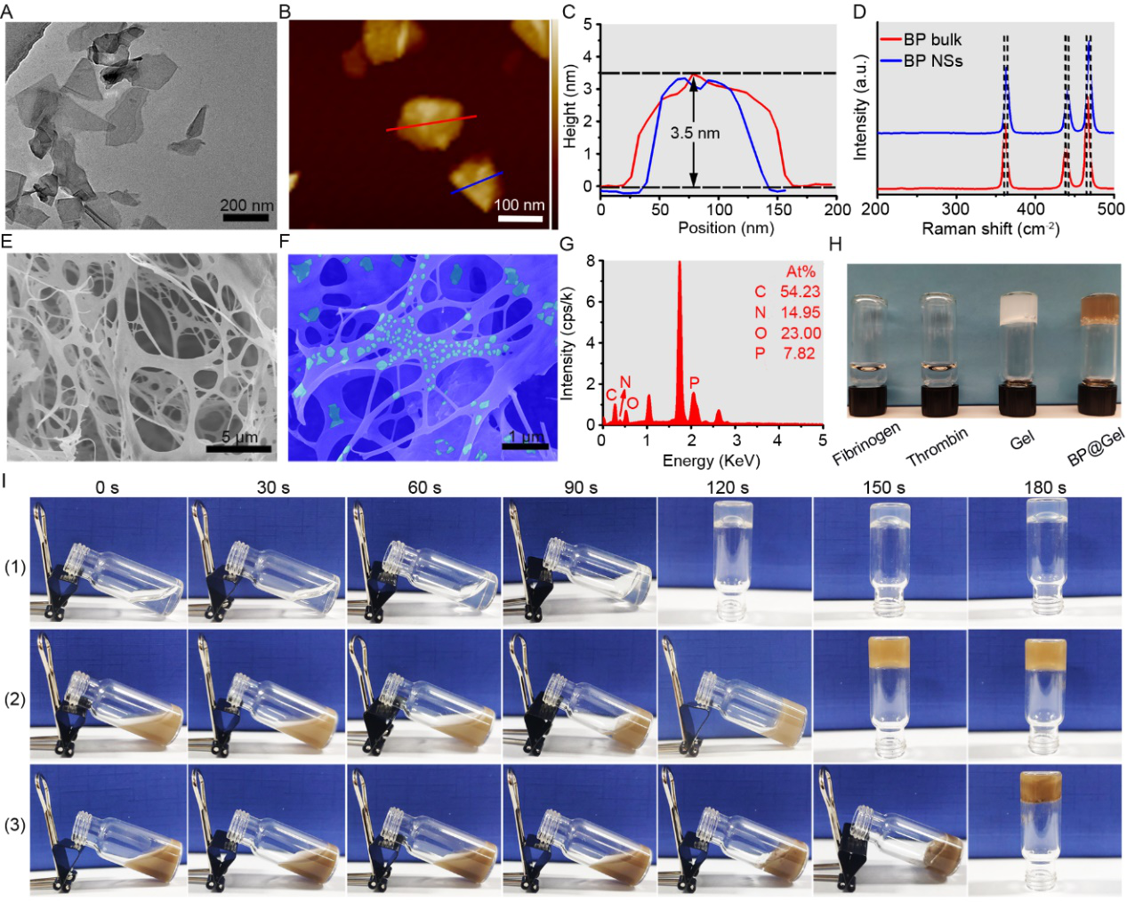 �D2. BP�����z�ı�����(A) BP�{��Ƭ��TEM�D��(B) BP �{��Ƭ��AFM�D��(C) BP �{��Ƭ�ĺ��������(D)��KBP��BP �{��Ƭ���������V��(E)���z��SEM�D��(F) BP@Gel�Ăβ�ɫSEM�D��(G) BP@Gel��EDX������(H) Gel��BP@Gel�Ĕ�(sh��)�a��Ƭ��(I)��ͬBP NSs��ȵ��w�S����ԭ/��Ѫø���z�����z�r�g: (1) 0 ��g/mL��(2) 50 ��g/mL��(3) 100 ��g/mL��