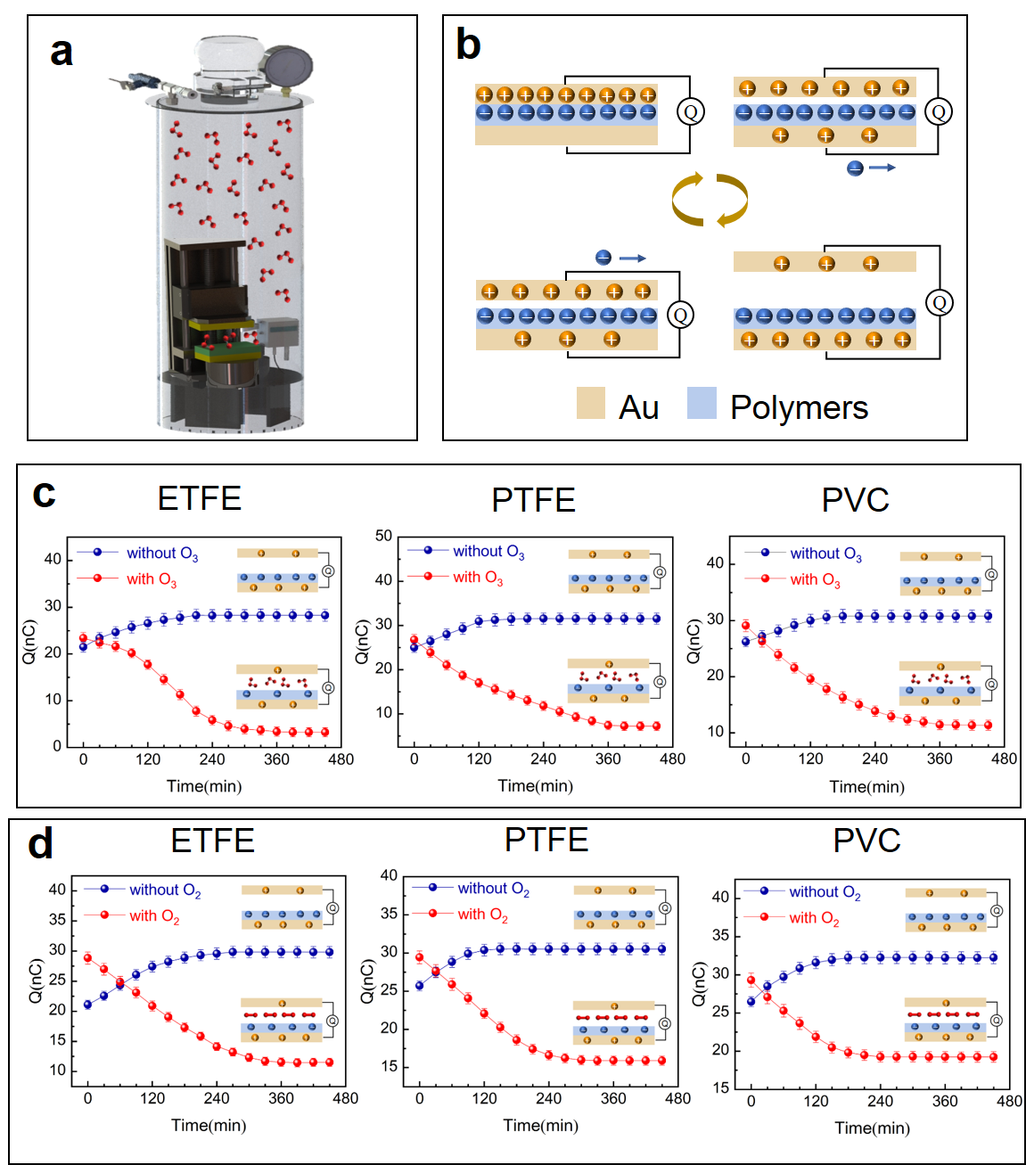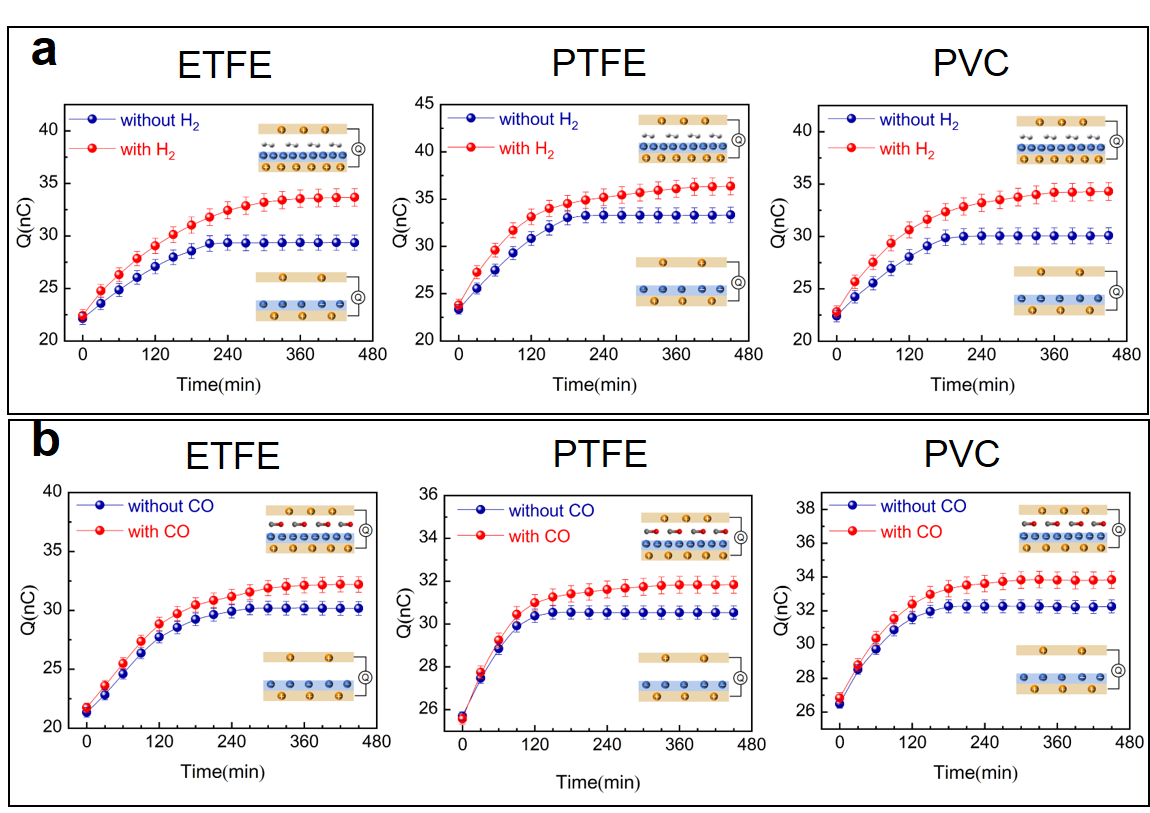 ���о����x��һϵ�оۺ��ﱡĤ��ETFE��PTFE��PVC������TENG�е�Ħ���Ӳ��ϣ������^�˲�ͬ�ۺ�����O3��O2��H2��CO����µĽ��|������ܣ���D1��2��ʾ���Y���������ۺ�������������O3��O2����p��������H2��CO�����������