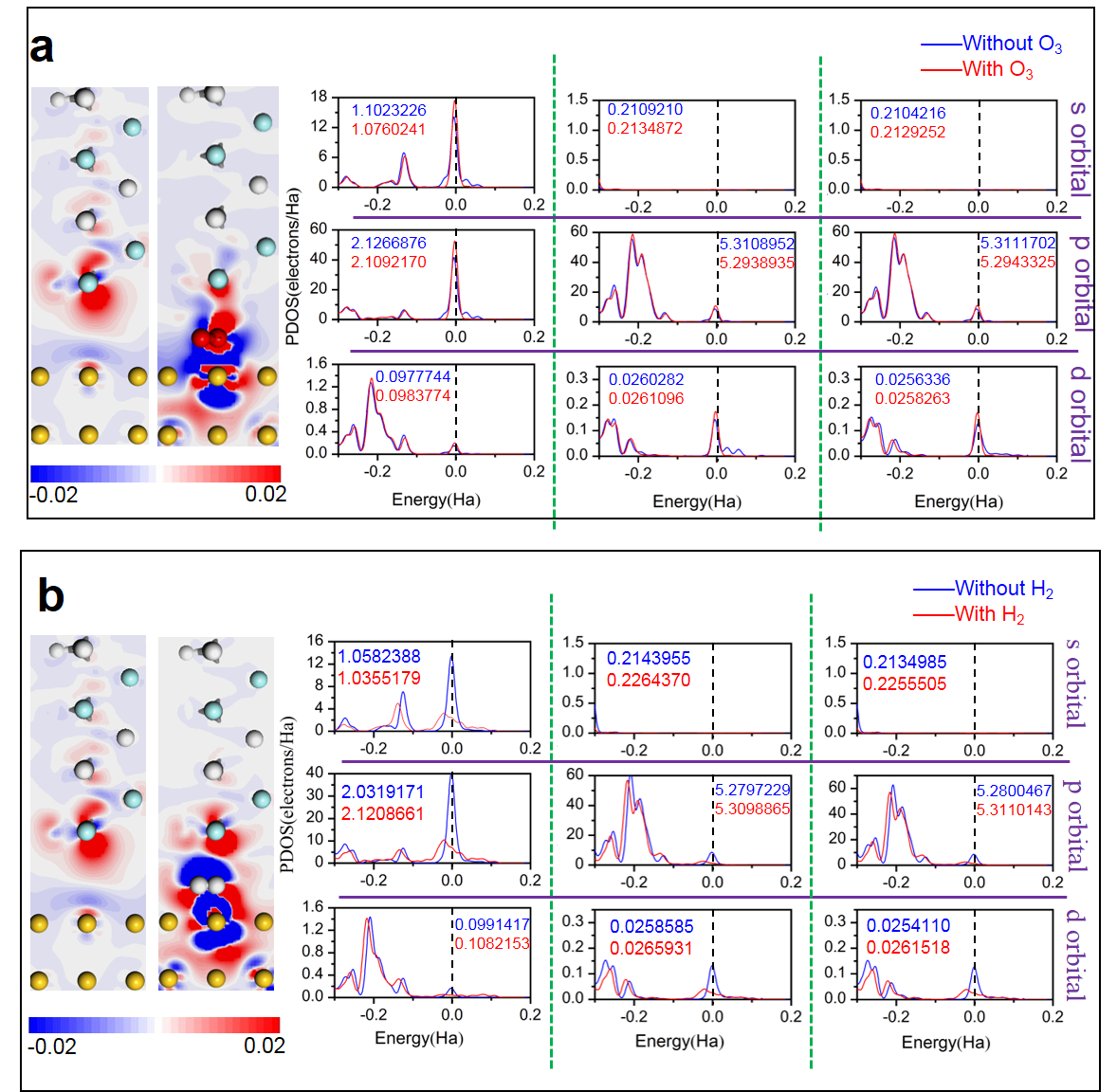 �D4 ����߀ԭ�Ԛ���µ�һ��ԭ��Ӌ��Y����(a) ����O3ǰ����|����늺ɲ���ܶȡ�Cԭ��PDOS��Fԭ��PDOS; (b)����H2ǰ����|����늺ɲ���ܶȡ�Cԭ��PDOS��Fԭ��PDOS��