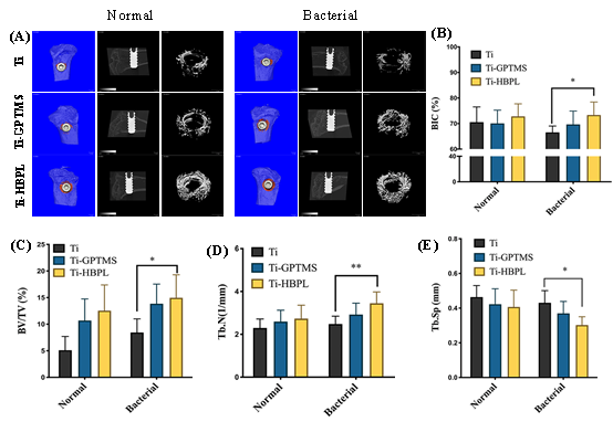�������Sɫ���������Ⱦ�Ĵ����ȱ�pģ�ͣ����������֧����ه�����ֲ���wֲ��3����c���սM��ȣ��Nֲ�w�������ǻ�еļ�����Ŀ���@�p�٣�����Ч�����á�ͬ�r��HEȾɫ��CD68Ⱦɫ���������c���սM�����ȣ������г�֧����ه����Ϳ�ӵķNֲ�w�ܜp���M�����װY������Ѫ���и��I�������Pָ��ҲδҊ�������f��ֲ���w�����ﰲȫ�����á�Micro-CT��MassonȾɫ��������Ti-HBPL�M�ķNֲ�w����ڼ�⁽M�ܸ��õش��M�¹ǵ��γɣ����M�Nֲ�w�c�M��֮�g�����ϣ������@�N���M�����ڸ�Ⱦ�M�и������@��