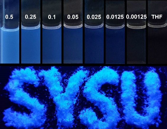 ��365nm��������£��������ͪ���w��ĩ�����Ě����Һ���ɮa���{ɫ�ɹ⡣����εı���ϩ/һ����̼���湲�����������ϡ��Һ���l�⣨��1.25 × 10-3 M�����������Һ���w�l�⣬���l�䲨�L��429nm�������F����������l�⣬�����Ҋ���V�̈́ӑB��ɢ��Y���C�����S����������оۼ��w���γɡ�����֮�⣬�������ͪ��Һ���w�ğɹ�����߀�ܼ��l���L��Ӱ푣��@Щ�Y����ʾ���������ͪ�l����ѭ�ؼ��l��C����Clusterization-Triggered Emission��CTE����