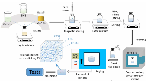 �l�ݼ��g�ǽ��;ۺ����ܶȺ��|������Ҫ�ֶΣ�������Ŀ՚�ጧ�ʃH��ۺ����1/10��ʹ�þۺ�����ĭ׃���˽^����ϡ������ߵ��ܶ���ĭ�ۺ���ğጧ�����Ƃ��p�|����ۺ�����P�I���ڡ����ڴ�����͌��H�����о��OӋ���Ƃ���һ�N���ж�Y���ĵ�����{��Ƭ(BNNSs)/���۱���ϩ��c-PS���ͺϲ��ϡ������ڼ�ˮ�����݄��������γ��^�̮a���đ���ʹ��ԭ������ֲ��ھۺ���ȵ�BNNSs�ڭh�Α����������ښ���֮�g���ݱڃ��γɭh�νY����ȡ��ֲ����������ݿյ��γɼ����lչʹ��ԭ�������B�ӵ�BNNSs֮�g�a����B�ӽY������K���ڰl���^���T����BNNSs������3D�W�j���ӂ��f��O�˸���ͨ������D1��ʾ����һ�����ݿa���ֽ��͟ጧ�ʣ���ˣ��ͺ��wϵ�ğጧ���cBNNSs�γɵľW�j�Y���������P����BNNSs�Č���ͨ·�Ę����c�l�ݱȡ�BNNSs�������ݿ�ֱ�����ݿ��ܶȵ��������P����D2��ʾ��������Ԕ���о����������،���Y���ۺ���ğጧ�ʵ�Ӱ푙C�����M��ӑՓ�ˌ���늳������p�����ӵ�Ӱ푡��о��Y�����������ݿY����BNNSs/c-PS����їl���³ʬF�����_1.28 W/m K�ğጧ�ʣ��h����ͬ�����������µ�δ�l���wϵ�ğጧ�ʣ�ԓ�����ܶ��½��˽ӽ�1/2���D3���D4��ʾ��