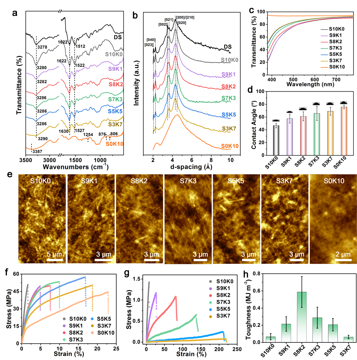 �D2 SKCF�ĽY������ò�����ܡ���ͬ��ȵ�SKCFs�ģ�a��FTIR�D�ͣ�b��WAXD�V�D����c����ȼs��23 ��m��SKCFs���������ʈD��SKCFs�ģ�d�����|�Ǻͣ�e��AFM������ò�D����ͬ��ȵ�SKCFs�ڣ�f���ɑB�ͣ�g����B�đ���-��׃�D����h����ͬ��ȵ�SKCFs�ڝ�B�µĔ�������