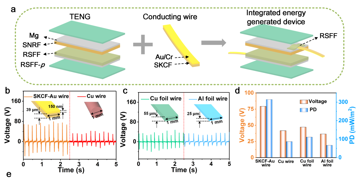 ������C�������������̖�Ă�ݔЧ�ʣ��о��ߌ�SKCF-Au�����cSNRF/�����z�ص���Ĥ��RSFF��TENG���B����������ȫ�������������D4a�������cͨ�^���y���ٌ����B�ӵ���ͬTENG��ݔ�������M�Ќ��ȣ��D4b��c�����Y��������SKCF-Au���cTENG�B�ӕr�����ݔ��늉���79.3 V��ݔ�������ܶȣ�PD����314.3 mW/m2���քe���B�ӂ��y���ٌ�����TENGݔ�����ܵ�1.7-2.2����2.8-4.7�����D4d�����@һ�����Ă�ݔЧ�ʵ�����SKCF-Au�����Ľ����Π�͌�늌��^��Č���ȣ��D4b��c��D����������Ҫ���ǣ�SKCF-Au������������ɽ����������������37 ��C��ø��Һ����28 d�����ʼs45%���C���������������ڿ�ֲ������I�����������F������ȫ������