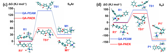�D2. (a) QA-EAM��QA-AEKģ�͵��o늄ݣ�ESP������b�� QA-EAM��QA-AEKģ�͵�Mulliken늺ɣ���c��QA-EAM��QA-AEKģ�ͻ�SNAr������ܣ���d��QA-EAM��QA-AEKģ��SN2������������