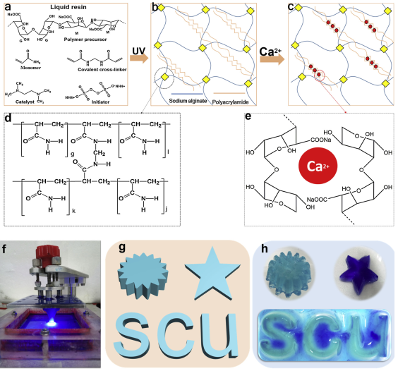 (a)�C(e) Scheme of the chemical composition of liquid resin and the mechanism of photo-polymerization and crosslinking; (f)�C(h) 3D printed gear, star and letters.