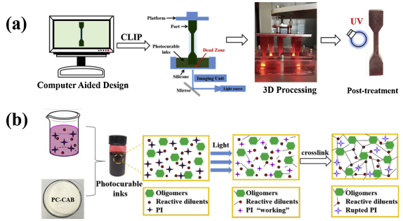 (a) Scheme of a CLIP printer showing its structures and working mechanism and the printing and UV-PT processes for a dog-bone sample. (b) Reaction mechanism of the PC-CAB ink under light radiation.