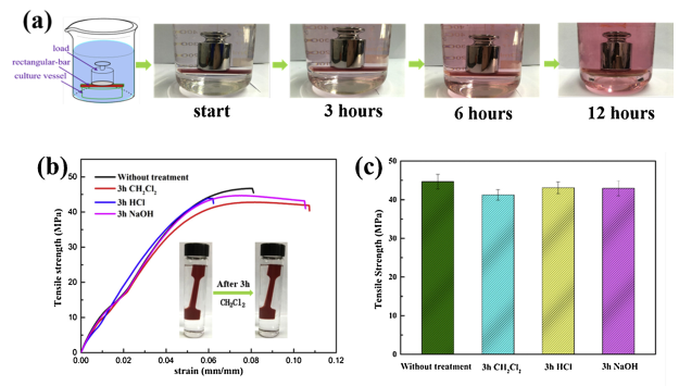 (a) Evaluation of the overall stability of a 3D printed bar (6 cm × 1 cm × 4 mm) with an appropriate indicator (200 g load) in DCM. Comparative mechanical (b, c) of the 3D prints subjected to treatments in DCM, 1.0 M HCl, 1.0 M NaOH solutions for 3 h, respectively. The inset picture in (b) shows the appearance of a dog-bone sample during 3 h immersion in DCM