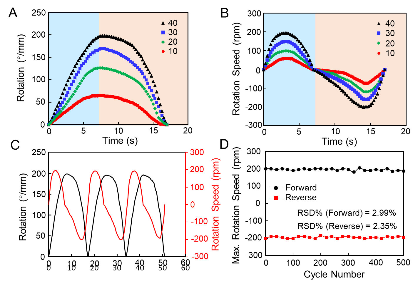 ͨ�^�������ܶȵă��������D�����켡���������D�_���_����200o/mm����������D���_����200 rpm ���D2A��2B�������⣬��500�ε�ѭ�h��ˮ-Óˮ�^���У��������������D�\�ӻ�������һ�£� RSD%��n=500���քe��2.99%������2.35%�������f�����켡����кܺõ�ѭ�h������ (�D2C��2D)�����]�������D�\���е������ٶȞ�21 rad/s2��ͬ�r��ʩ�ӵĘ��~����I = 1.2 × 10?8 kg·m2 ���D�ӑT�������~�����鼡������������1937���������D�����켡��a�����������؞�488 mN·m/kg��