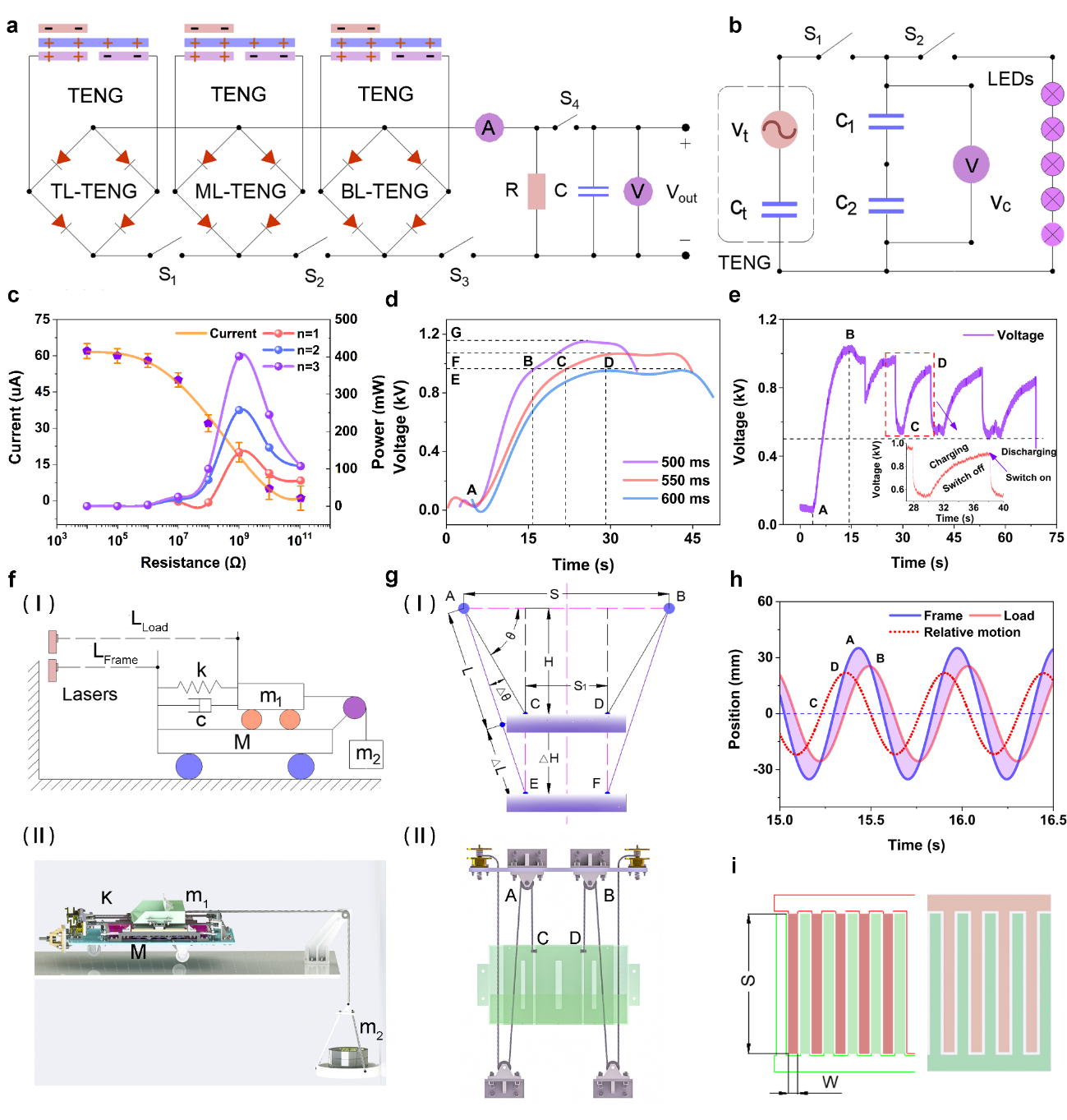 �D3 ���ݔ���c����Ӌ(j��)�㡣 a.���ݔ��ԭ��D��b.��(g��)TENG�ĵ�Чģ�͈D��c.����ؓ(f��)�d�����D��d-e.��ݳ���늉�����(sh��)�D��f.�\(y��n)��(d��ng)��Чģ�͈D��g.ʡ���C(j��)��(g��u)��Чģ�͈D��h.����(du��)�\(y��n)��(d��ng)λ�ƈD��g.�Ÿ�ʽ늘O����(sh��)�D��