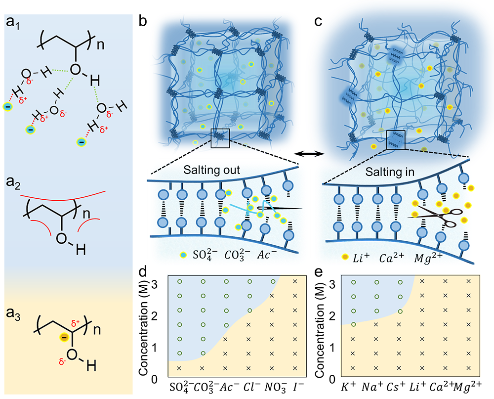 ᘌ�����������UCLA�R����F��Ϻ���ͨ��W�����h�F����ͨ�^��ͬ�x�ӵ��خ��ԁ��Ƃ����W���ܿ��{��ˮ���z��ͨ�����x�����߷���机߷���ˮ��ˮ֮�g�������N���ܵ����������D1a��ʾ�����ȣ�һЩ�x�ӿ��ԘO��ˮ��ˮ���Ķ��Ɖķ�����c��ˮ��ˮ֮�g�Ě��I���D1a1���������ijЩ�x�ӕ�ͨ�^���ӷ�����܇��ı��揈������������朵���ˮ�ԣ��D1a2����������������x�ӿ���ֱ�ӽY�ϣ�ʹ�÷���朵ĘO���������Ķ������˾ۺ�����ܽ�ȣ��D1a3�������w���f���T��SO42-��CO32-֮��x�ӱ��F����һ�͵ڶ�Ч���������܌��¾ۺ����������߷��Ӱl���ۼ�/�Y�����D1b���������x������NO3- ��I- ���t���F�������N����ã��ܽ�����ӣ��D1c��������ϵ�y���о���ͬ��Ӱ�������Hofmeister�����x���˶�N�c�}�����}���^�����ϩ����PVA�����}��Һ�еĠ�B���� Na2SO4��ȸ���0.5 M��PVA���}ˮ���γ����z������NaI��Һ������ʹ�x�ӝ�����ߵ�3 M��PVA�Ա�����Һ��B��ͨ�^���^5 wt��PVA�γ����z�r���}��Һ�����PVA ���}��Һ���γ����z���y�׳̶���ѭ���У�SO42-> CO32-> Ac-> Cl->NO3-> I-����x�ӌ�PVA�����z���������Ƶ��خ������������О�K+> Na+��Cs+> Li+��Ca2+��Mg2+��ͨ�^ϵ�y�Č��@����PVA�γ����z������x�Ӻ����ȗl������D1 d��e��ʾ��