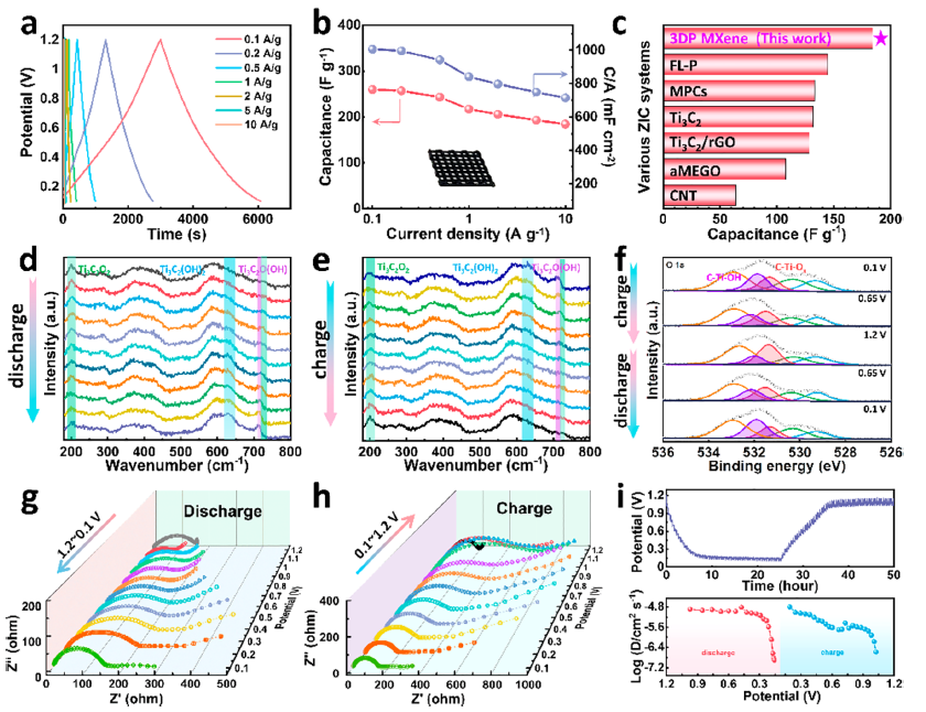 �D3. 3D��ӡMXene늘O��ZIC�е�늻��W(xu��)�О�.��a��3D��ӡMXene늘O�ڲ�ͬ����ܶ��µ�GCD����.��b���ڲ�ͬ����ܶ��£�3D��ӡMXene늘O���|(zh��)������e�ı����.��c���c�īI(xi��n)���������ZIC�������|(zh��)������ݱ��^.��d, e��3D��ӡMXene늘O�ڣ�d����늺ͣ�e������^���е�ԭλ�������V.��f��3D��ӡMXene늘O��늻��W(xu��)ѭ�h(hu��n)�^���е�XPS O 1s�V.��g, h��ZIC�ڣ�g����늺ͣ�h������^���е��gλEIS�D.��i��ZIC������GITT������Ӌ�����õĔU(ku��)ɢϵ��(sh��).