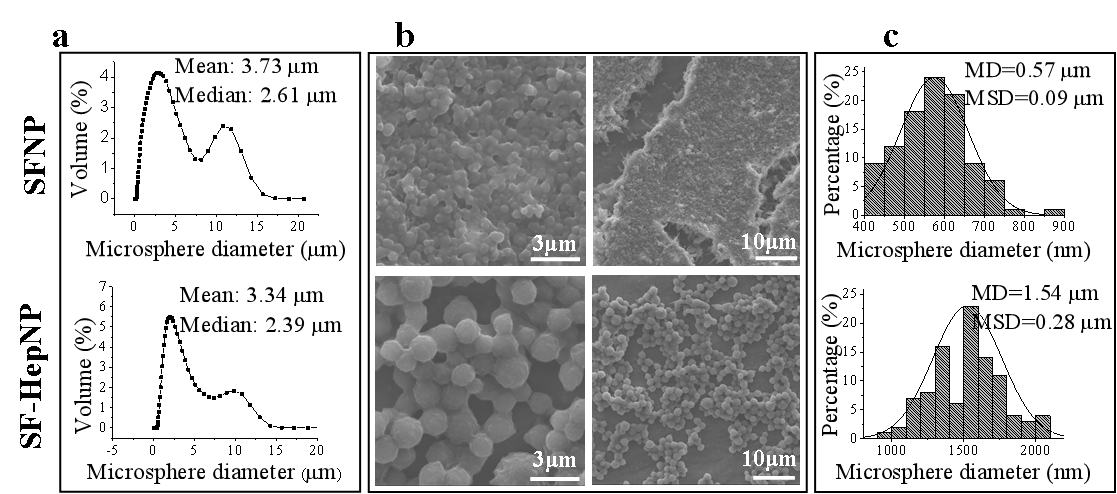 �D3 ��a��DLS��������ֱ���ֲ�����b��SFNPs��SF-HepNPs��SEM��ò����c��ImageJ�y���yӋ����ֱ���ֲ���