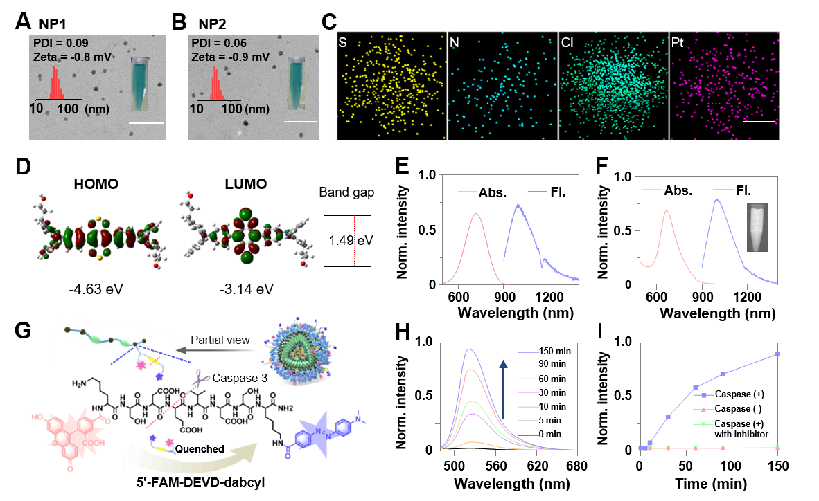 �D1.�Ɍ�(du��)caspase-3ø푑�(y��ng)�Ŀ����オ��Ľ��t����^(q��)�ɹ�ۺ���{�����ӵ��w���������A���ͣ�B��TEM��DLS ��(du��)NP1��NP2�ı�������C��STEM ��(du��)NP2�ı�������D��10��HOMO��LUMO܉���ֲ�����E��10 �ͣ�F��NP3�����չ��V�͟ɹ�l(f��)����V����G��H2O2����ľۺ��オ�⡢NP3�ֽ��Լ��S��caspase-3��(du��)����̽�5''-FAM-DEVD-dabcyl�Ļ����H������I��NP3�е�5''-FAM-DEVD-dabcyl ��(du��)caspase-3푑�(y��ng)������(l��i)�ğɹ�����׃����