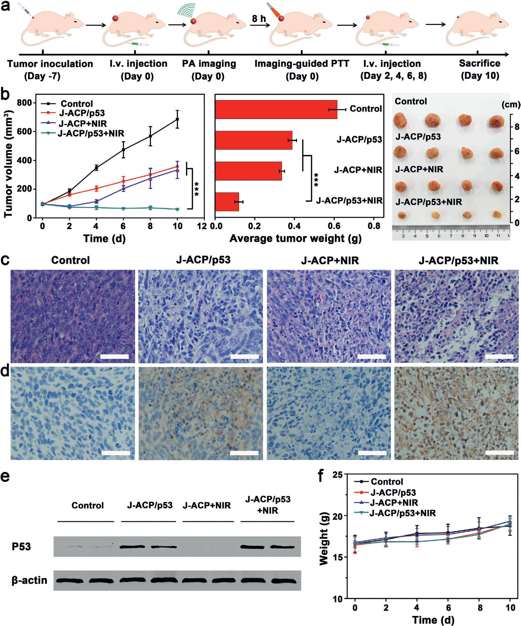 ��Ƥ������С���(d��ng)��ģ���У��ĈD4b���Կ�����(sh��)�(y��n)�MJ-ACP/p53+NIR�������@���[�����L���ƣ��Լ��ί��Y(ji��)�����[������������ƬJ-ACP/p53+NIR���F(xi��n)����(y��u)���������[��Ч�����D4c�[����H&E��Ƭ��������������MJ-ACP/p53+NIR���F(xi��n)�����@���[���M���p����ͬ�r(sh��)ͨ�^���߽M����western blot�l(f��)�F(xi��n)�ί�����P53�ı��_(d��)���D4d,e����С���w�������������f�����Ͼ����^�͵��w��(n��i)���ԣ��D4f����