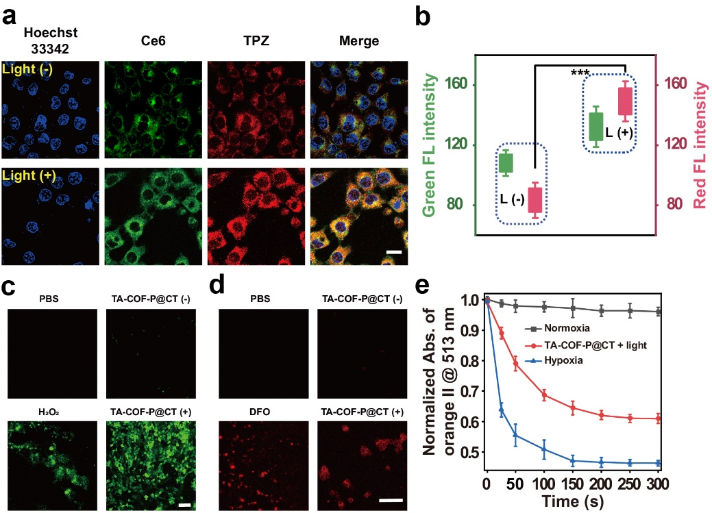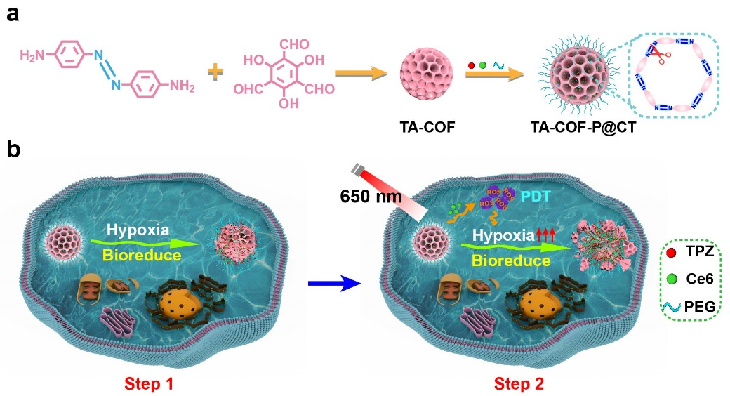 ᘌ�(du��)�����Ć��}���Ͼ���W(xu��)�Y�aȺ���ڈF(tu��n)�(du��)�Ƃ���һ�N�⼤������еĴ�(li��n)푑�(y��ng)ˎ����f�{������COF���о��ˆT��(g��u)���˺���ż���I�ǼܽY(ji��)��(g��u)��COF��������������Ce6���ͷ��������Ϳ���ǰˎ����������TPZ����ͬؓ(f��)�d��COF�С���(d��ng)�@�N푑�(y��ng)��COF��TA-COF-P@CT���M(j��n)�뵽�������[���Еr(sh��)��COFż���I�ǼܽY(ji��)��(g��u)��(hu��)������(n��i)߀ԭø���������ѣ��ų�ؓ(f��)�d��ˎ��M(j��n)һ������(d��ng)�wϵ�ܵ����t��⣨NIR�������䣬Ce6����ͨ�^PDT���ļ�(x��)����(n��i)������a(ch��n)����������ROS�������[����(x��)�����S����������ģ��[�����h(hu��n)��׃�ø��ӷ������@�N�ӄ��ķ��������M(j��n)һ���̼��[����(x��)�������ɴ�����߀ԭ��ż��ø����COF�е�ż���I���ѣ��M(j��n)������ጷ�Ce6��TPZ��ͬ�r(sh��)������������TPZ�ڼӄ��ķ����h(hu��n)���¼��ٷֽ�ɻ������ɻ����ҷ����µ�ˎ�ﶾ�Եõ��M(j��n)һ������(qi��ng)���cROS��ͬ�f(xi��)�����ƉIJ������[����(x��)����������@�R�̈́�(d��ng)�B(t��i)��ɢ��Y(ji��)�����C��(sh��)TA-COF-P@CT�����cNa2S2O4��һ�N������ż��߀ԭø������(y��ng)����(d��o)�½��x�����۽��@�R�ͼ�(x��)����(sh��)�(y��n)�C��(sh��)��TA-COF-P@CT�ڹ��մ̼��£����Լ���ጷ�Ce6��TPZ����������(qi��ng)�ļ�(x��)�����ԡ����ԓ�F(tu��n)�(du��)�����ٰ���ֲС��ģ���Ќ�(du��)TA-COF-P@CT�M(j��n)���˻��w�ɹ������x�w���ٟɹ�������C��(sh��)��TA-COF-P@CT�������[����λ��Ч�������[�����L���ƌ�(sh��)�(y��n)�M(j��n)һ���C��(sh��)��TA-COF-P@CT�����@�����ְ�Ч�����Ҿ������õ����ﰲȫ�ԡ��C��������ԓ�о�����COF�Ķ���Ժͷ���푑�(y��ng)�ԣ���(g��u)����һ��(g��)������(li��n)푑�(y��ng)�Ŀ��M(j��n)��PDT�ͻ����f(xi��)ͬ�ί��Ĵ�(li��n)��ˎ���wϵ����COF�����������t(y��)�W(xu��)�I(l��ng)��đ�(y��ng)���ṩ����˼·��