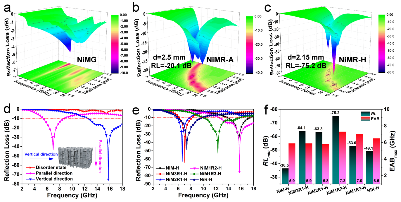 ͨ�^����o����עPDMS��֬���ɟo�p����NiMR-H�����z�Y�����õ�����늴Ņ����yԇ�ďͺϲ��ϣ���NiMR-H�����z�ܶȃH��6.45 mg cm-3������֧�λ��wPDMS�ȵĺ����H��0.64 wt%����Ч��Q�˂��y��ĩ����������ɢ������������ߵĆ��}���������ܽY���@ʾ��ͨ�^�غ�߀ԭ���Կ���Ч��ߚ����z�ǼܵĽ�����Ժ͘O��Ч�����Y��Ni�{��朵Ĵœp��Ч���Լ����S��������z��늴Ų��Ķ��ط������ã�NiMR-H�����z���ԫ@����ͷ���p��(RLmin=-75.2 dB)�Լ�������ղ���(EABmax=7.3 GHz)����ȶ��ԣ��˻�߀ԭ��NiMR-A�����z����ӂ�ݔͨ·���γɱ��F���^��������Ч�������⣬NiMR-H��������z�ĿY�������Ԍ����������������ڴ�ֱ��ƽ�п���ĸ����ԣ���ȶ��ԣ��������䷽��ֱ�ڿ���ɫ@����������ܣ��D2����
