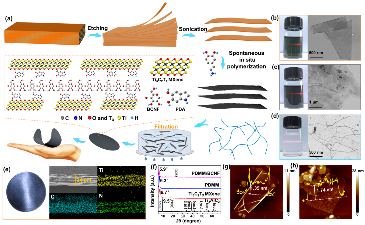 ��헹����У��о��F꠲���ԭλ�l�ۺϵķ�����MXene�{��Ƭ�ӱ�����������һ�Ӿ۶�Ͱ���PDA�����ӣ��ڎ�������MXene����Ե�ͬ�r����Q��MXene�{��Ƭ�������ԵĿƌW���}���������ýY�������{�صij����������w�S�ؼ{���w�S��BCNF�������P�о��ɹ�ԔҊ���F���һ헹���Cellulose, DOI: 10.1007/s10570-021-03765-2������ճ�Y֧�����Ի��ף�ͨ�^�cMXene/PDA�ڜp���h���е���T���ԽM�b�^�̣��@���˾��з�����Ӡ�Y���ı�Ĥ������PDMM/BCNF����������ˮ���ӿ��ق�ݔ�{��ͨ�����Mһ�����F���@�N��Ĥ�������h���еĝ��׃���߶����У�����푑���(1.6 s)��׃�δ�(176��)������ݔ����(6.5 N m-2)�����c��ͬ�r��߸�늌��ʡ������Ŀ������Ⱥ��g�Եȃ��ݡ�