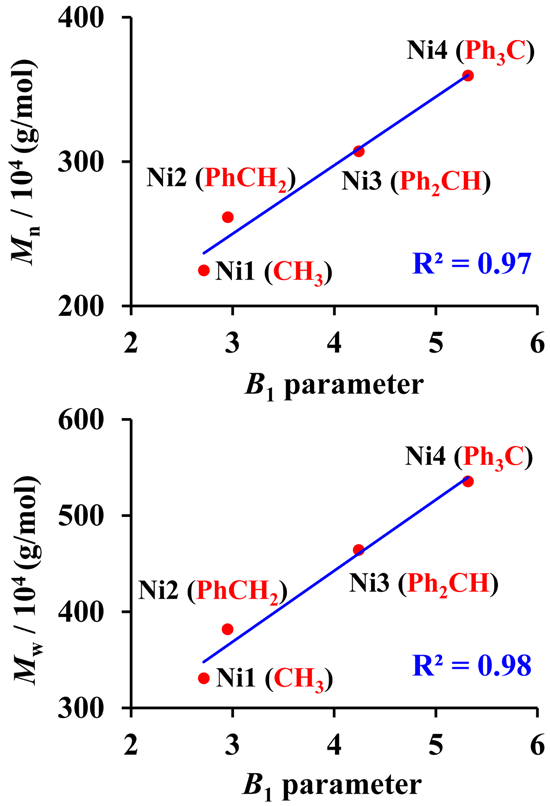 ��4���Ժ�Ҋ��������ʽ�U���������g�Y���c�ۺ��������֮�g���Pϵ���l�F�ۺ����Mn��Mw�c�����Ŀ��gλ��Sterimol B1�����ʾ����Pϵ���D4����