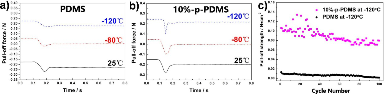 ������һ�������Ƃ��p-PDMS��������ճ�����ϵ�ճ�������u���Y(ji��)��������p-PDMS��������ճ�������Ҝؠ�B(t��i)��ճ����(qi��ng)�ȿ��ԺܺõؾS�ֵ�����-120�档���֮�£�������ͬ�ϳɷ����Ƃ��PDMS��������ճ����������Y(ji��)���ض����£��s-65�棩��ճ����(qi��ng)�Ƚ�����50%���ϡ�-120�������ѭ�h(hu��n)ճ����(sh��)�(y��n)�M(j��n)һ��������p-PDMS��������ճ�����ϵ��L�r(sh��)ճ��-Ó�����ܿ����þS�֣��D4����Ȼ����PDMS��������ճ������������͜��µ�������׃���Լ��������A(y��)ؓ(f��)�d�����^�̌������Y(ji��)��(g��u)��ɵ��۷e��׃����(d��o)������m(x��)ճ���^�̽���ķǹ��ν��|����(y��ng)�����f��������K��(d��o)����ѭ�h(hu��n)ճ����(qi��ng)�ȳ��F(xi��n)�@���½����D5�����о�����ͬ�r(sh��)�����˸ߜؼ�٤��ݗ�Ռ��������ܵ�Ӱ푡���(sh��)�(y��n)�Y(ji��)��������p-PDMS�ߜ�?z��)᷀(w��n)�����܃�(y��u)��������100��ߜحh(hu��n)�����þS����ճ�����ܡ����^��PDMS������������t����һ���̶��Ͻ���ݗ��p�����������ڸ߄����¡�