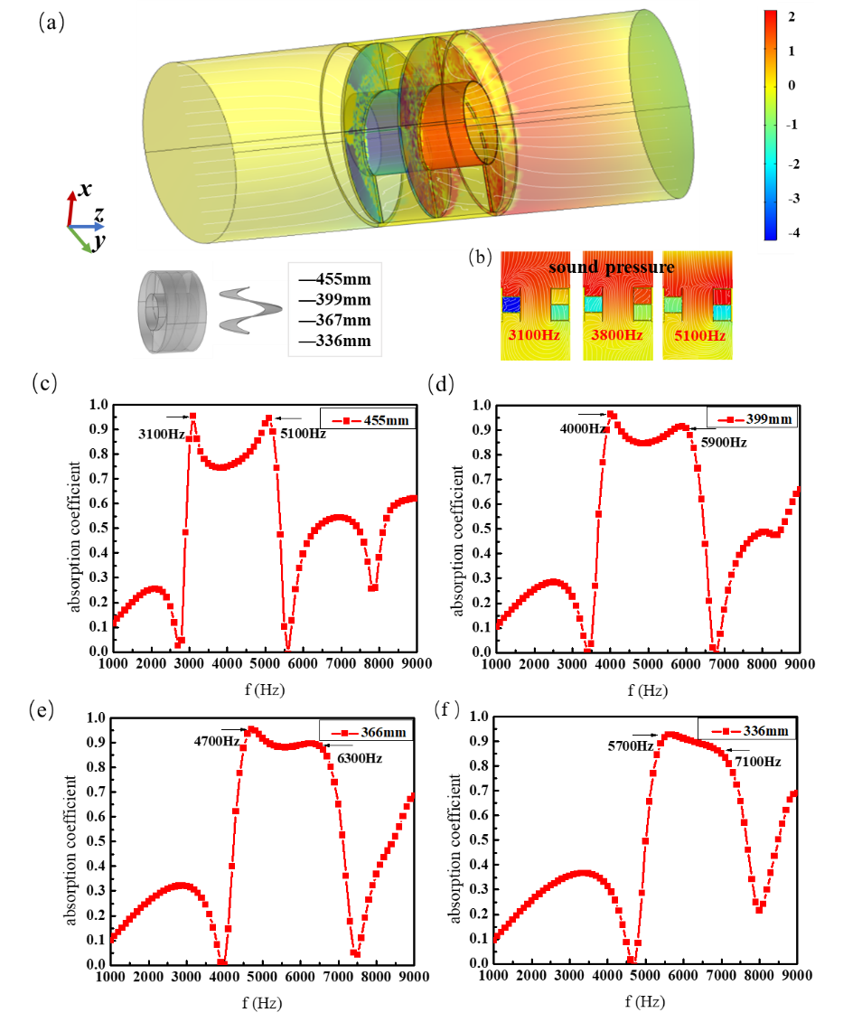 �D3�鲻ͬ�����L(zh��ng)�Ȍ�(du��)����ϵ��(sh��)��Ӱ푡�(a)����ԪӋ(j��)��ģ��ʾ��D;(b)�L(zh��ng)�Ȟ�455mm��������Ԫ��3.1 kHz��3.8 kHz��5.1 kHz̎�������ٶȷֲ����档�ɫ��ʾ���ֲ�����ɫ����ʾ�ٷֲ�;(c)-(f)�����L(zh��ng)�����Ξ�336mm��366 mm��399 mm��455 mm����ϵ��(sh��)������