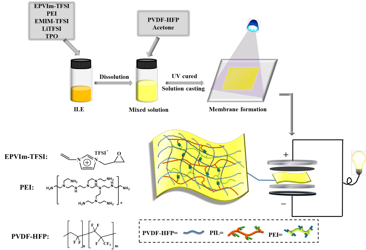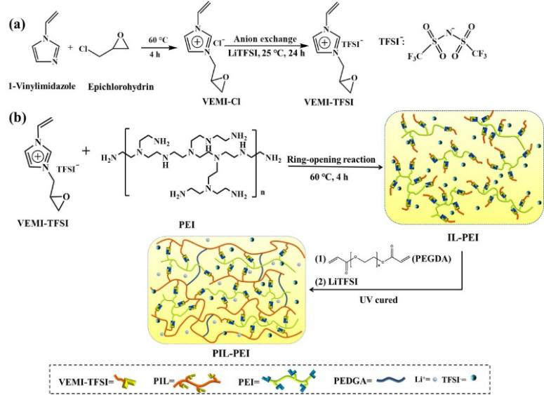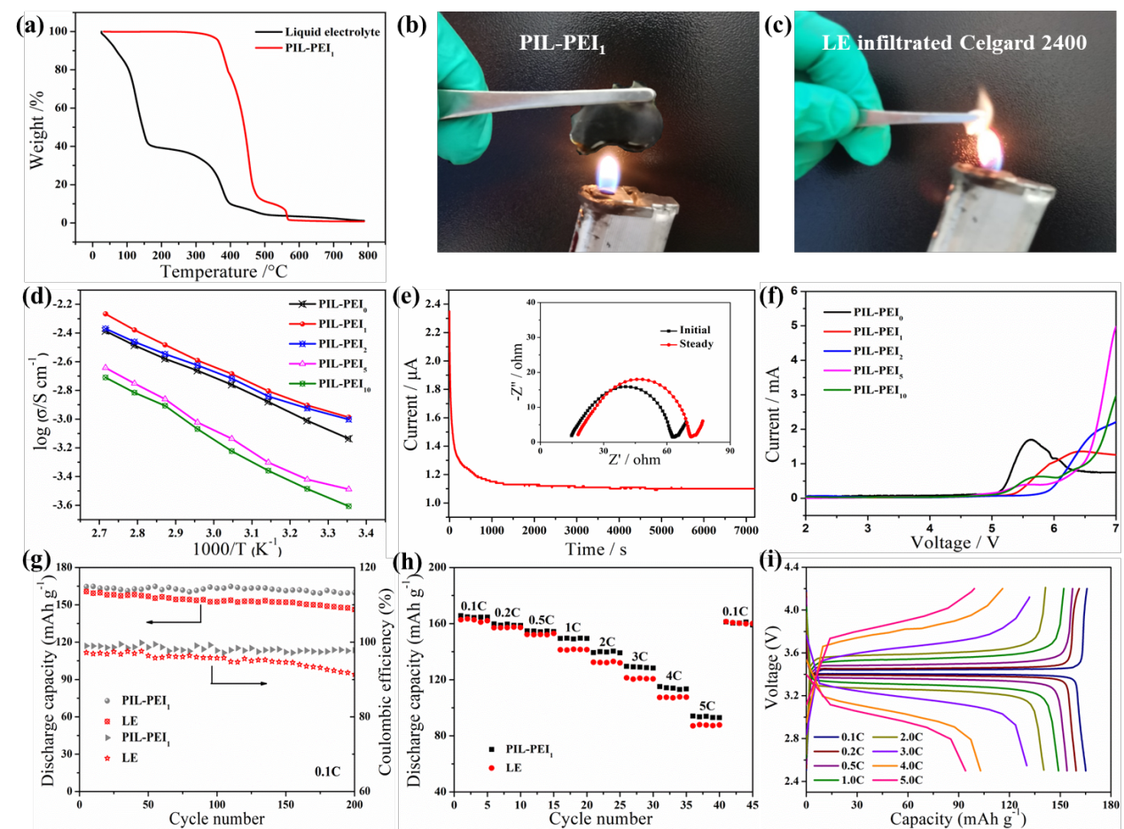 ���У�һ�ͨ�^�h��ILs�c����ϩ����(PEI)�����Ҷ�������ϩ����(PEGDA)�M���p���ۺ��Ƃ���ʹ̑BPILs늽��|(PIL-PEI)����D1����ԓ늽��|���õ���ȼ���c�᷀���Ա��C��늽��|����x��늳��Б��Õr�İ�ȫ�ԣ�����늌����c��x���w���ʷքe�ɸ��_1.03 mS cm-1�c0.47��늻��W���������Һ�B늽��|��չ��5 V (vs Li/Li+)���ϡ�����PIL-PEI�M�b�İ�늳���0.1 C�����µij�ʼ��늱������͎��Ч�ʷքe��165 mAh g-1��99%����ѭ�h200�κ������������ʞ�97.1%��